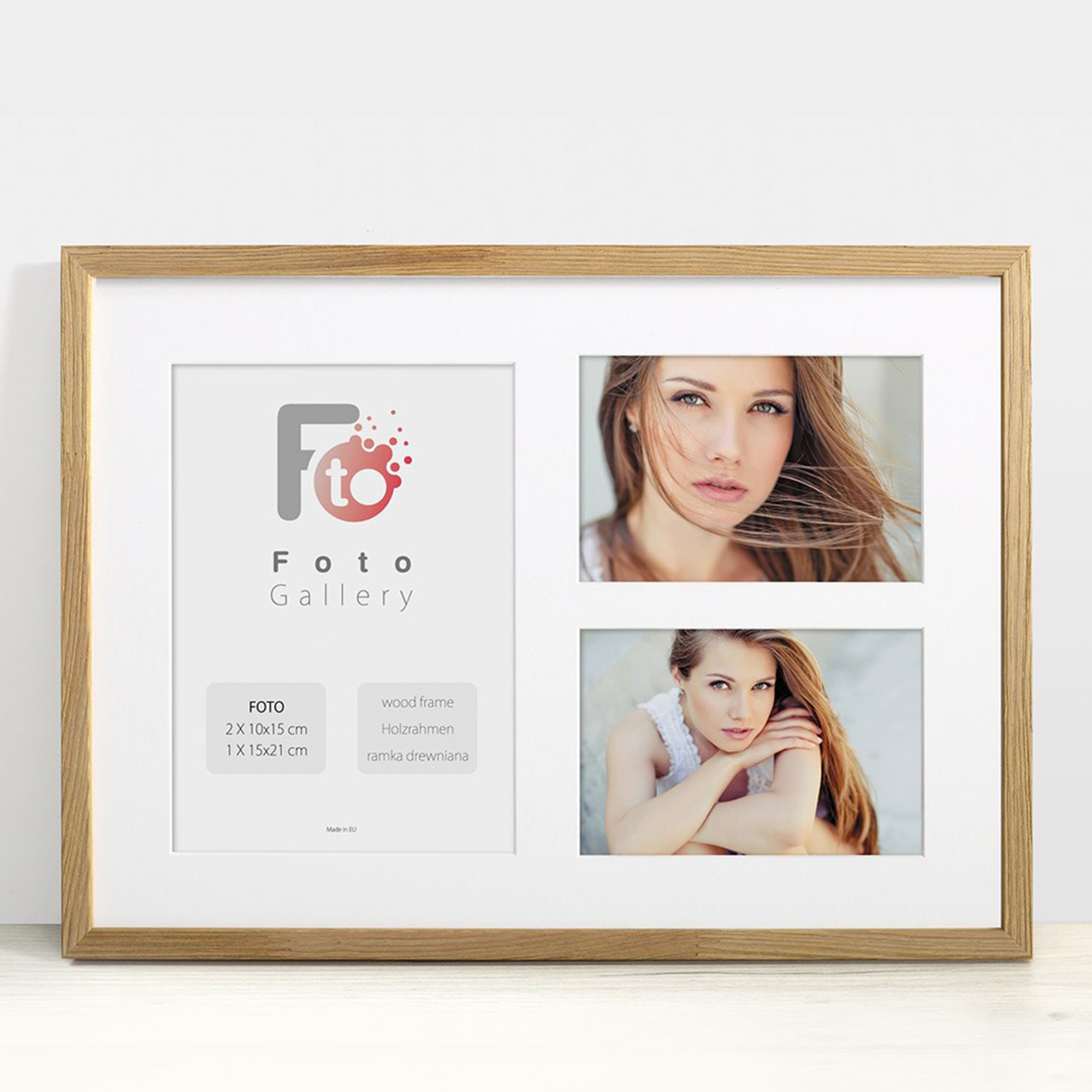 • Foto galeria drewniana ramka z passe partout na kilka zdjęć. Do oprawy zdjęć 1 x 15x21cm, 2 x 10x15cm. Model: Natural 28x39