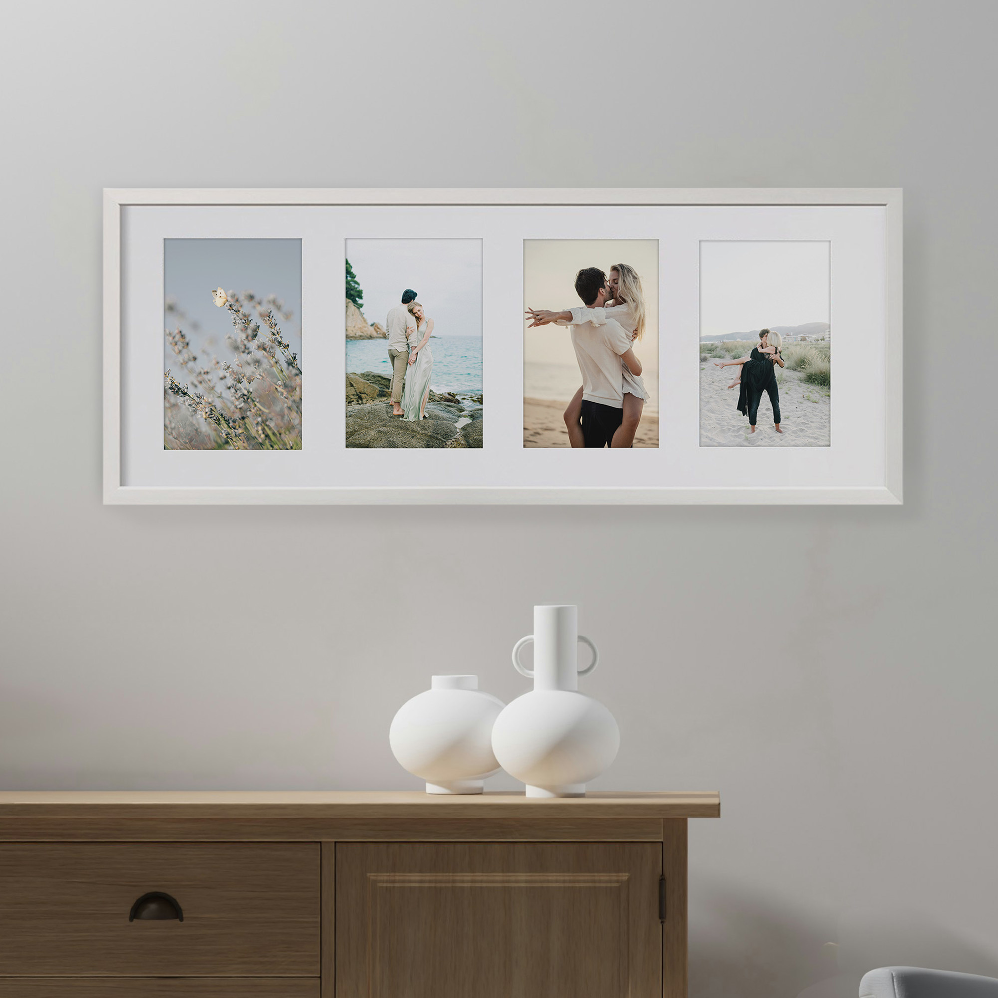 Ramka foto galeria drewniana na kilka zdjęć - White 23x66 (wymiar ramy wewnętrzny) odpowienia do oprawy zdjęć o formacie 4x13x18 cm. Kolor biały