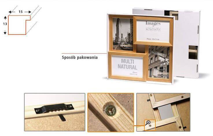 - Multirama naturalna z kolekcji MULTI NATURAL 41 to ramka drewniana na 4 zdjęcia o wymiarze: 4x10X15 cm. Ramka o przekroju profilu: 15x13 mm.