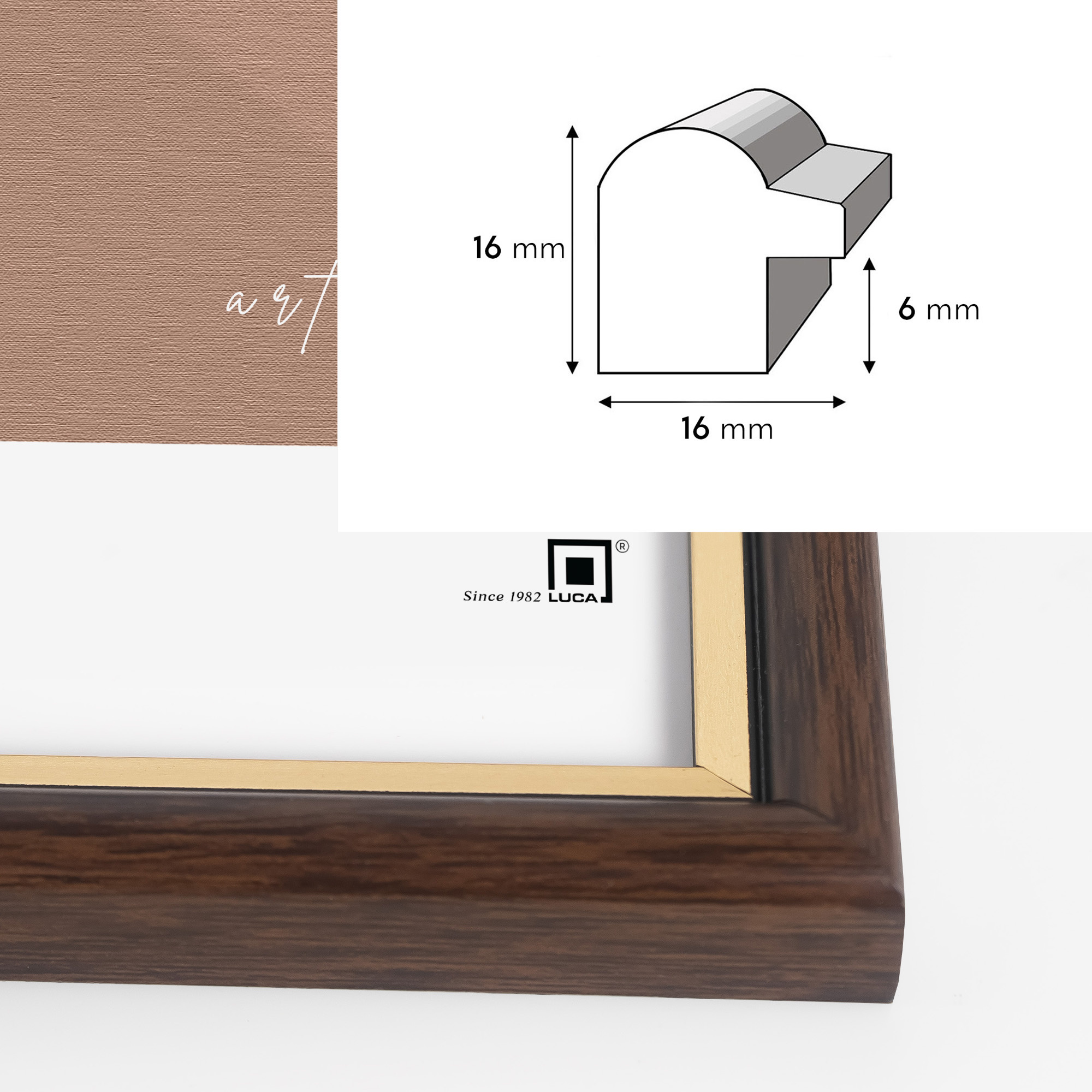 Elegancka ramka z serii DRI CL 4 w kolorze głębokiego brązu ze złotym paskiem to piękne połączenie klasyki i nowoczesności. Te połączenie pięknie będzie eksponować fotografie, grafiki lub dyplomy. Kolor głębokiego brązu z akcentem złota przykuje uwagę dzięki pięknemu przejściu kolorów. Profil ramy 16 mm wysokości i 16 mm szerokości jest zarazem delikatny i zaznaczony, potęgując wysoką jakość i styl.
