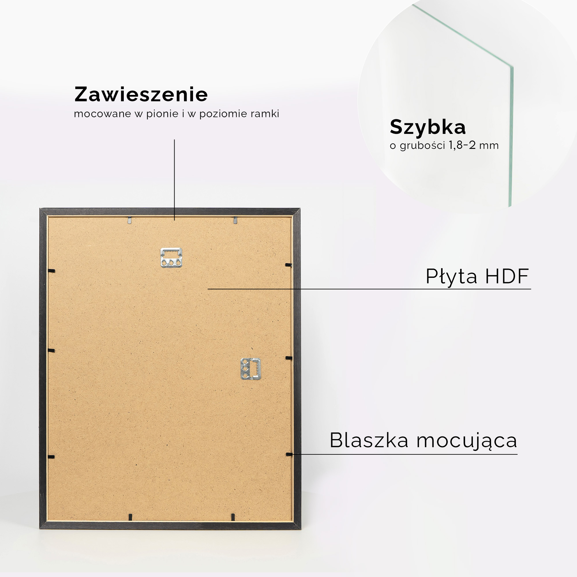 • Blaszki mocujące: miękkie blaszki mocujące tył ramki, zapewniają możliwość wielokrotnego otwierania