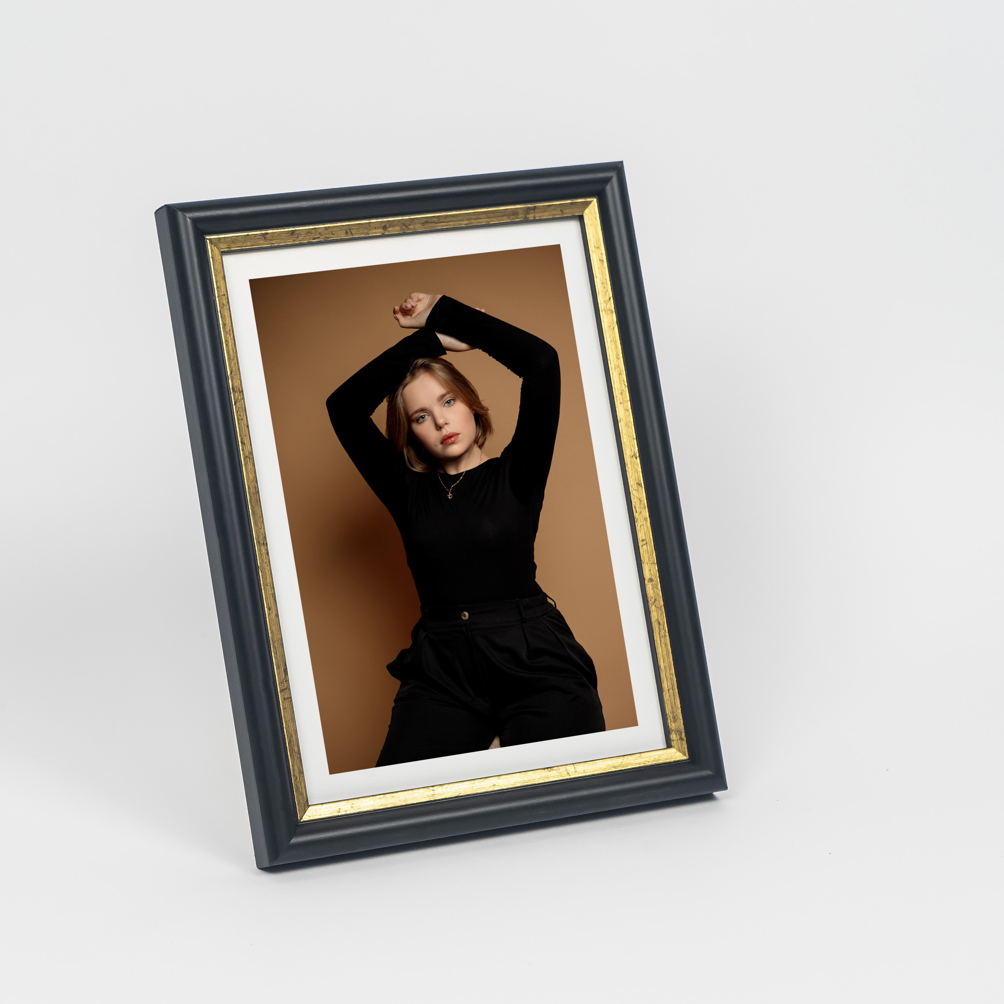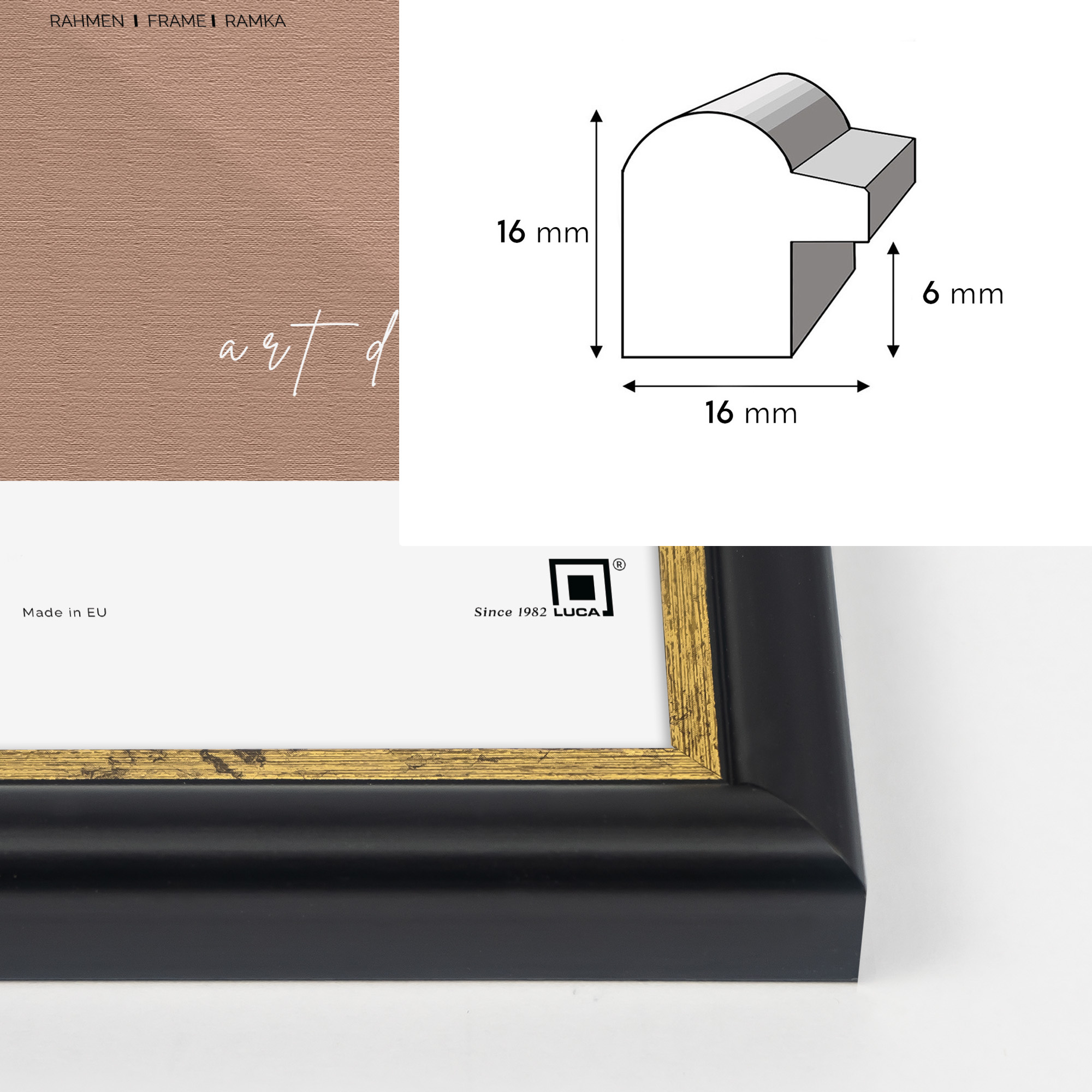Elegancka ramka z serii DRI CL w kolorze czarnym ze złotym paskiem to piękne połączenie klasyki i nowoczesności. Pięknie wyeksponuje fotografie, grafiki lub dyplomy. Kolor czarny z akcentem złota przykuje uwagę dzięki pięknemu przejściu kolorów. Profil ramy 16 mm wysokości i 16 mm szerokości jest zarazem delikatny i zaznaczony, potęgując wysoką jakość i styl.