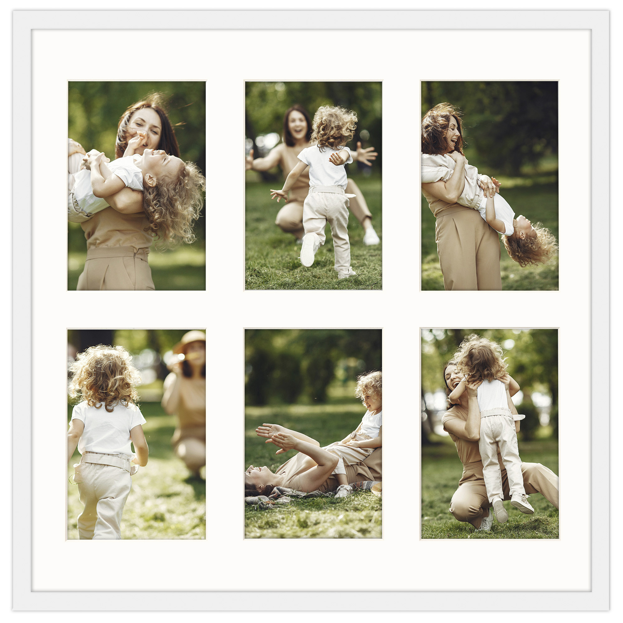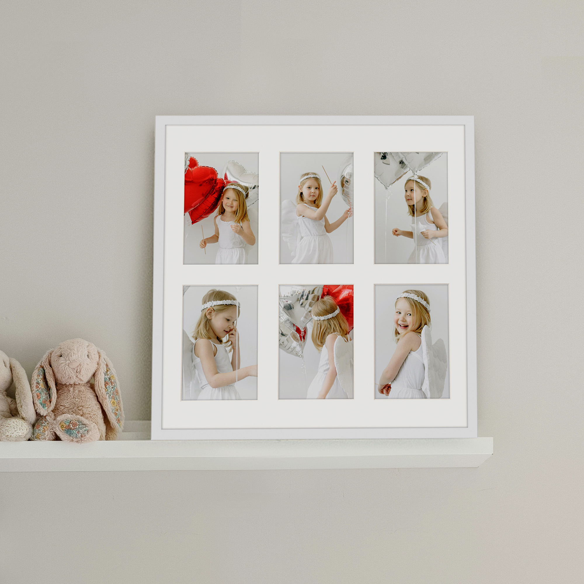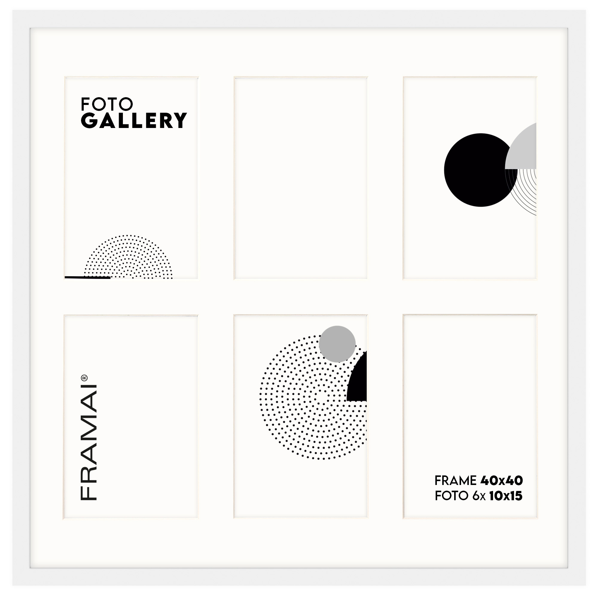 Ramka na 6 zdjęć - Foto Galeria 40x40 cm (wymiar ramy wewnętrzny) w kolorze białym odpowiednia do oprawy sześciu zdjęć o formacie 10x15 cm. Kolor ramki biały z jasnym Passe Partout