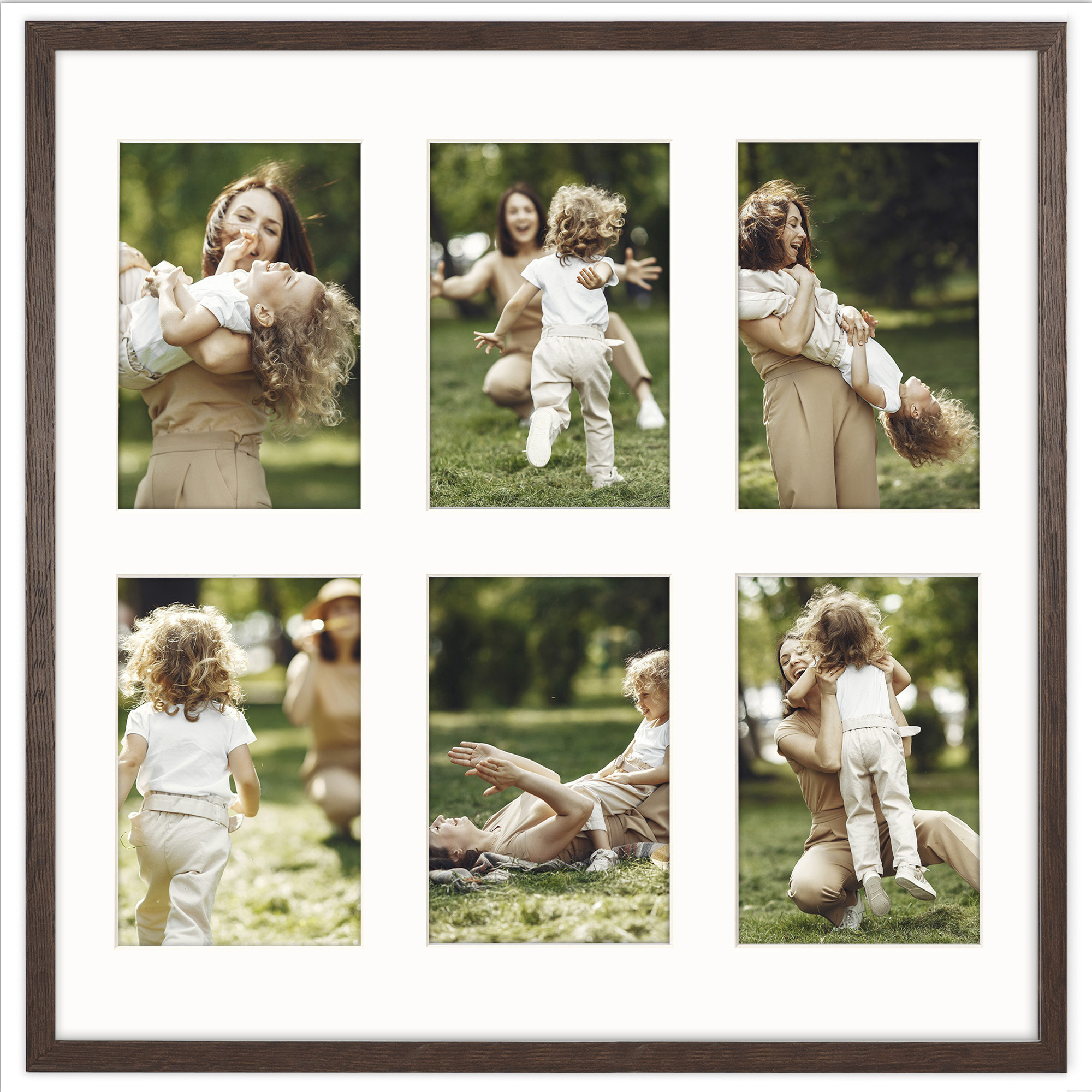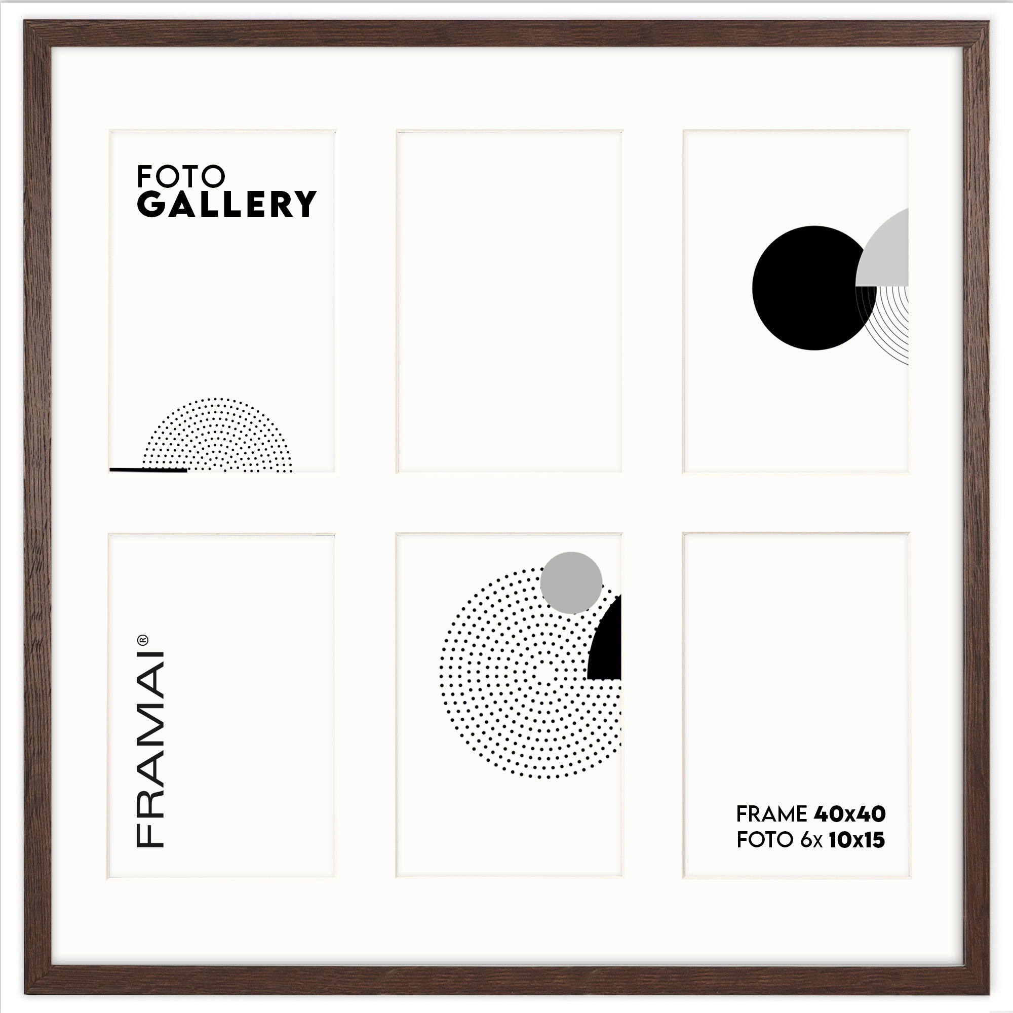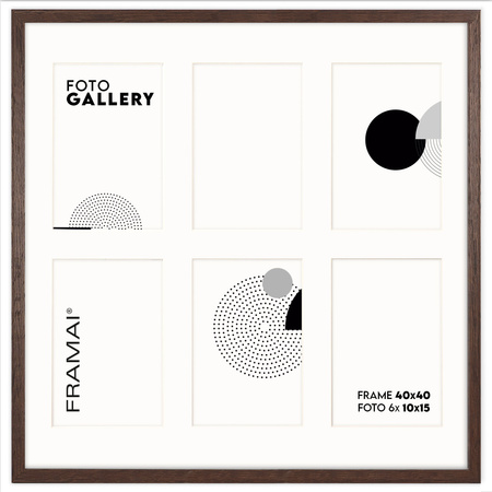 Ramka na 6 zdjęć - Foto Galeria 40x40 cm (wymiar ramy wewnętrzny) w kolorze brązowym odpowiednia do oprawy sześciu zdjęć o formacie 10x15 cm. Kolor ramki brązowy z jasnym Passe Partout