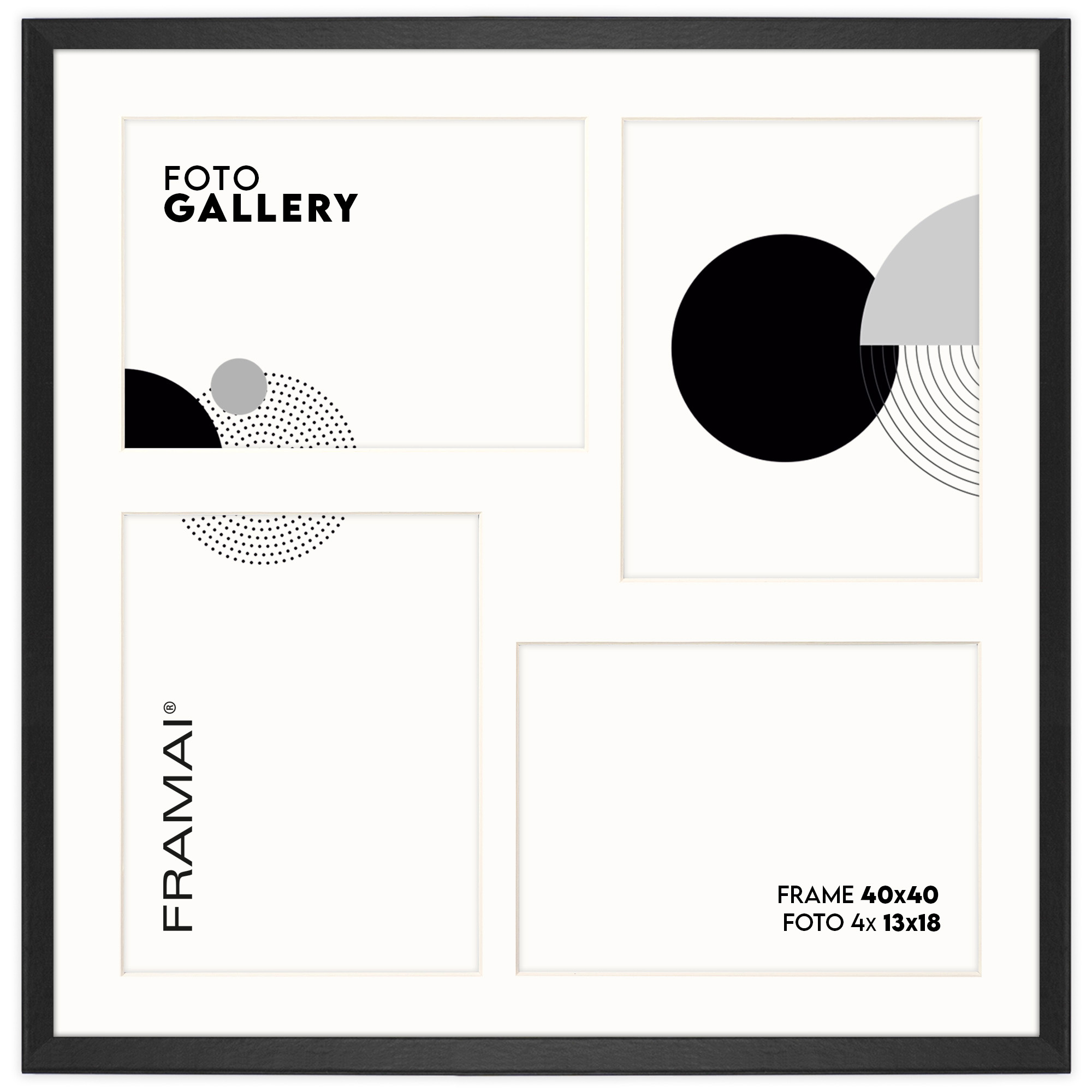 Ramka na 4 zdjęcia - Foto Galeria 40x40 cm (wymiar ramy wewnętrzny) w kolorze czarnym odpowiednia do oprawy czterech zdjęć o formacie 13x18 cm. Kolor ramki czarny z jasnym Passe Partout