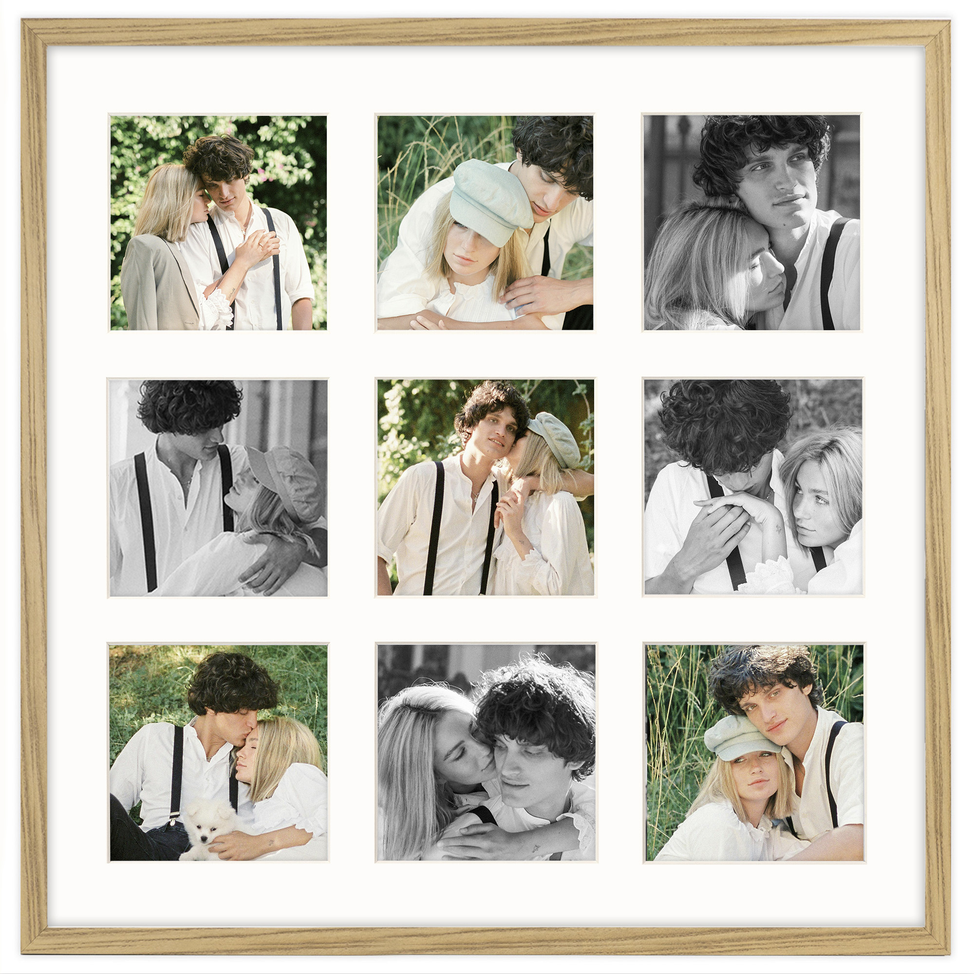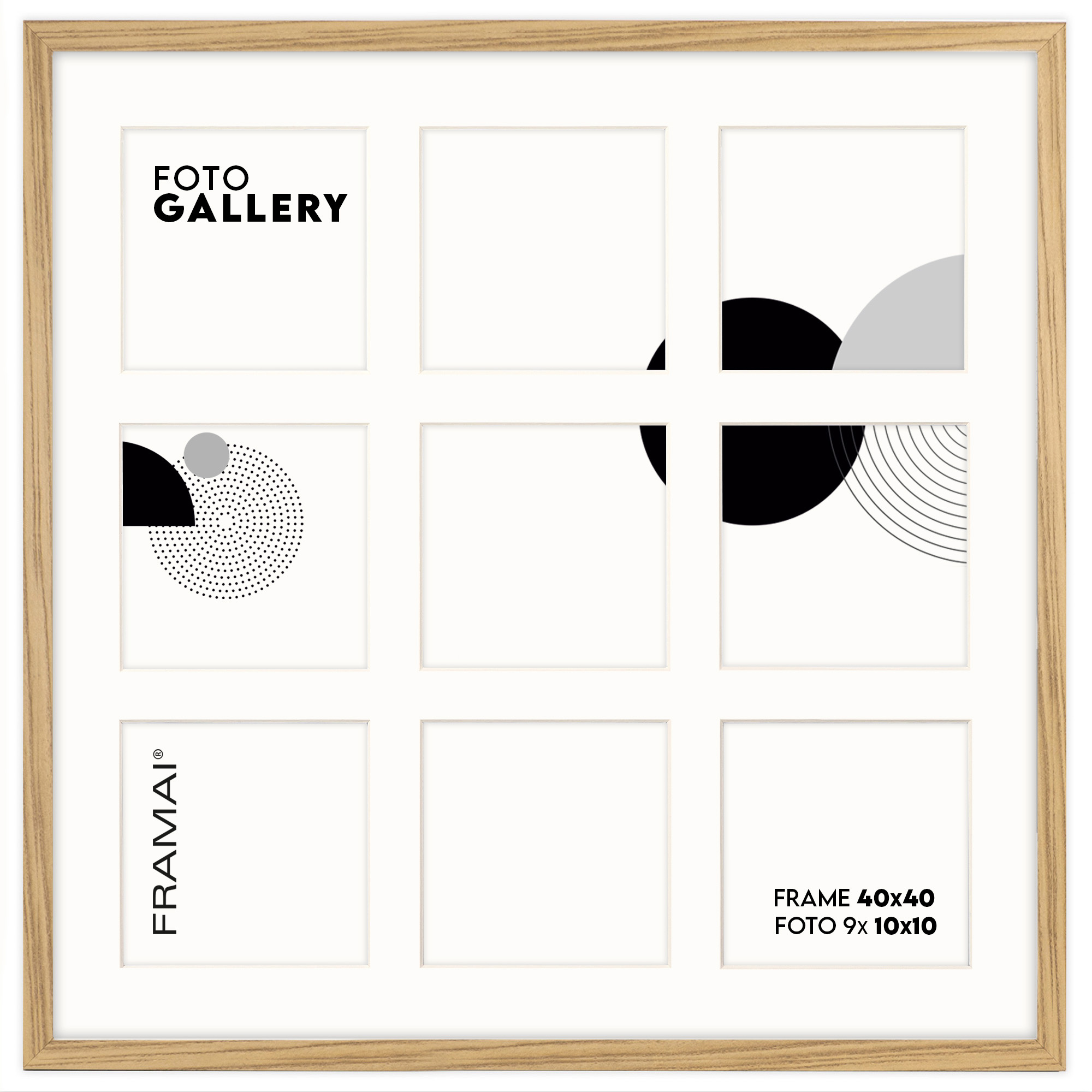 Ramka na 9 zdjęć - Foto Galeria 40x40 cm (wymiar ramy wewnętrzny) w kolorze dębowym odpowiednia do oprawy dziewięciu zdjęć o formacie 10x10 cm. Kolor ramki dębowy z jasnym Passe Partout