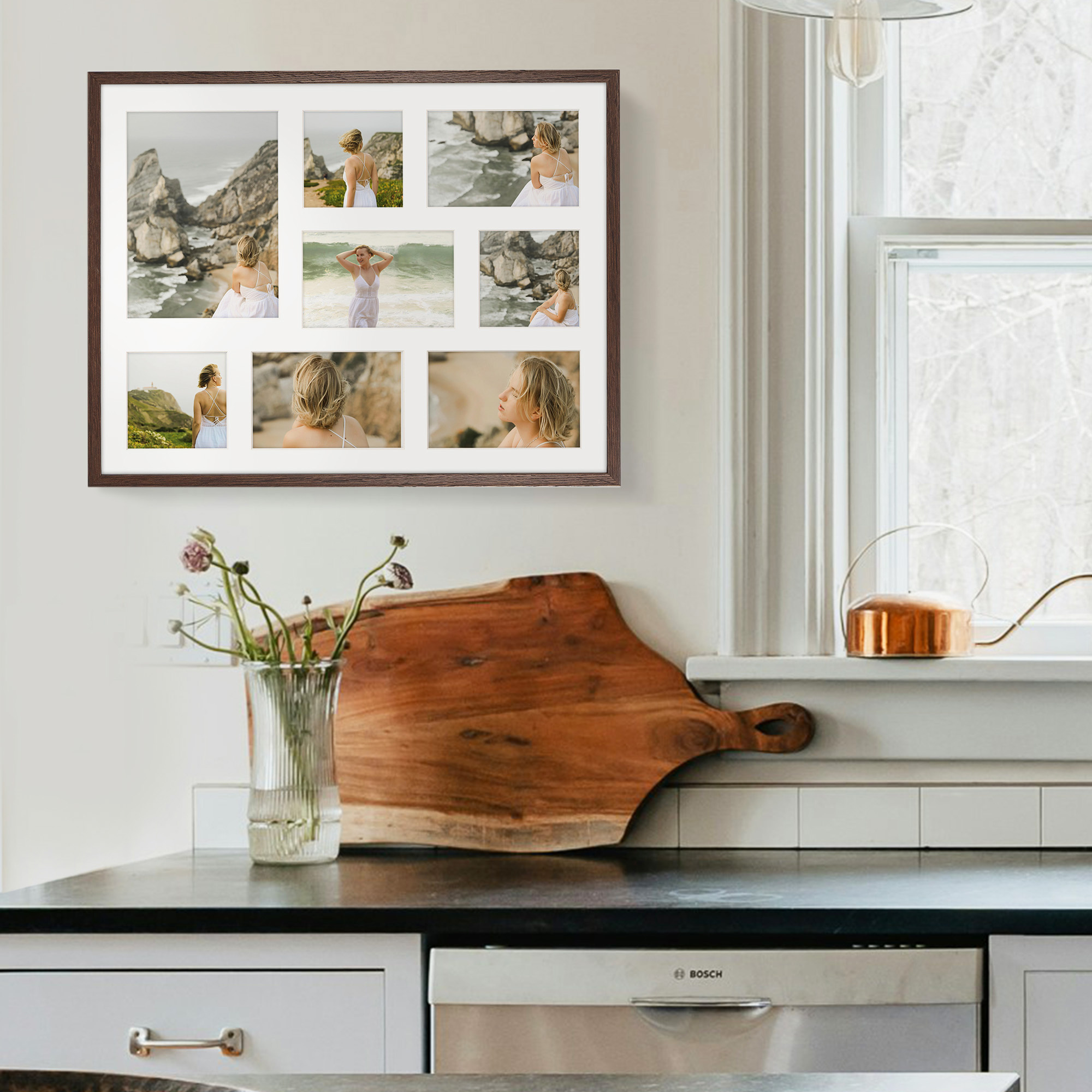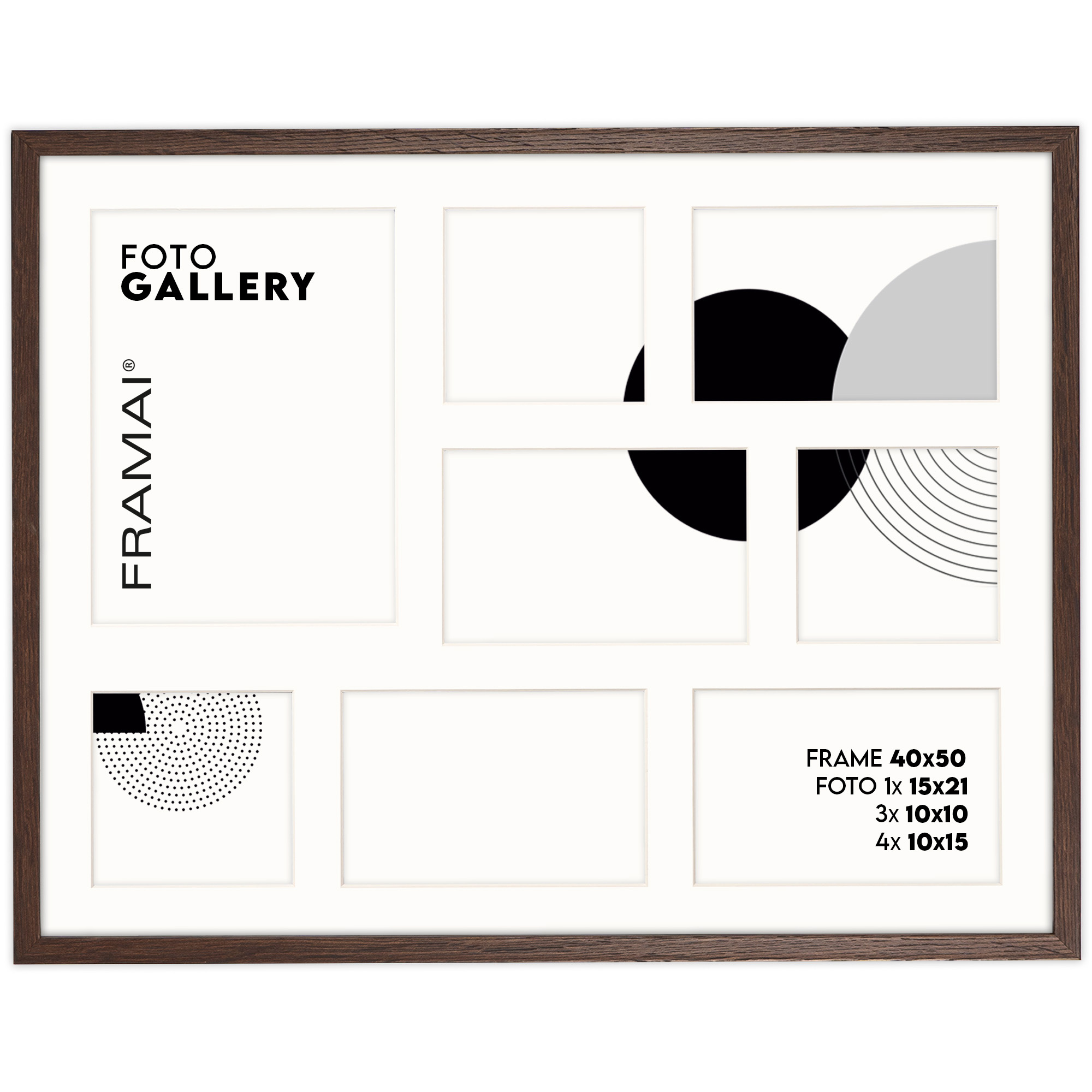 Ramka na 8 zdjęć - Foto Galeria 40x50 cm (wymiar ramy wewnętrzny) w kolorze brązowym odpowiednia do oprawy ośmiu zdjęć: 3x 10x10 cm, 4x 10x15 cm, 1x 15x21 cm. Kolor ramki brązowy z jasnym Passe Partout