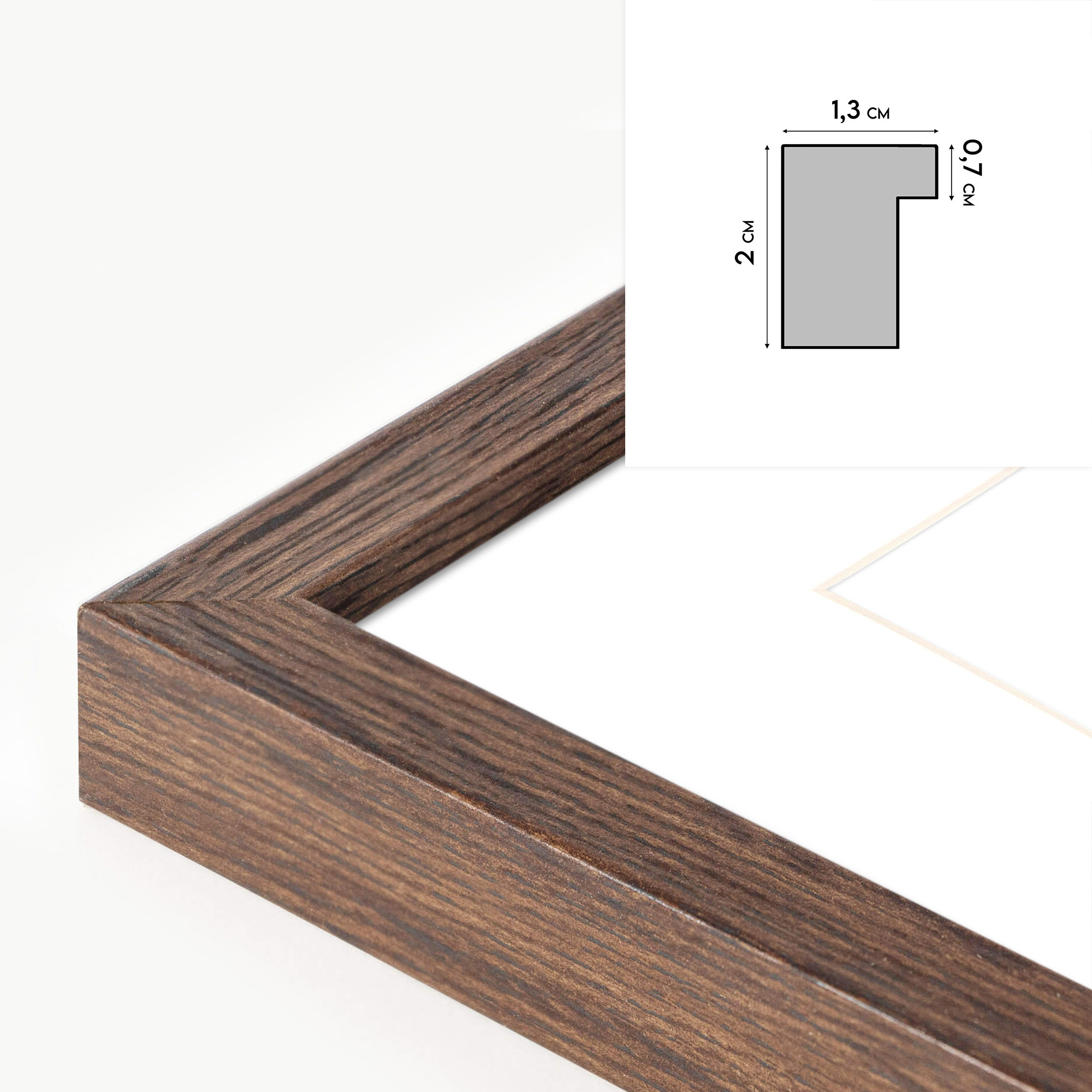Nowoczesna, prosta w formie foto galeria w brązowym kolorze o przekroju profilu ramy 13x20 mm. Doskonała propozycja do oprawy ośmiu zdjęć w jednej ramie. Foto galeria wyposażona jest w jasne passe partout, które pozwala na umieszczenie 8 fotografii: 3x 10x10 cm, 4x 10x15 cm, 1x 15x21 cm. Ramka wykonana jest z ekologicznego MDF. Foto Galeria 40x50 dostępna jest również w innych kolorach: białym, dębowym i czarnym.