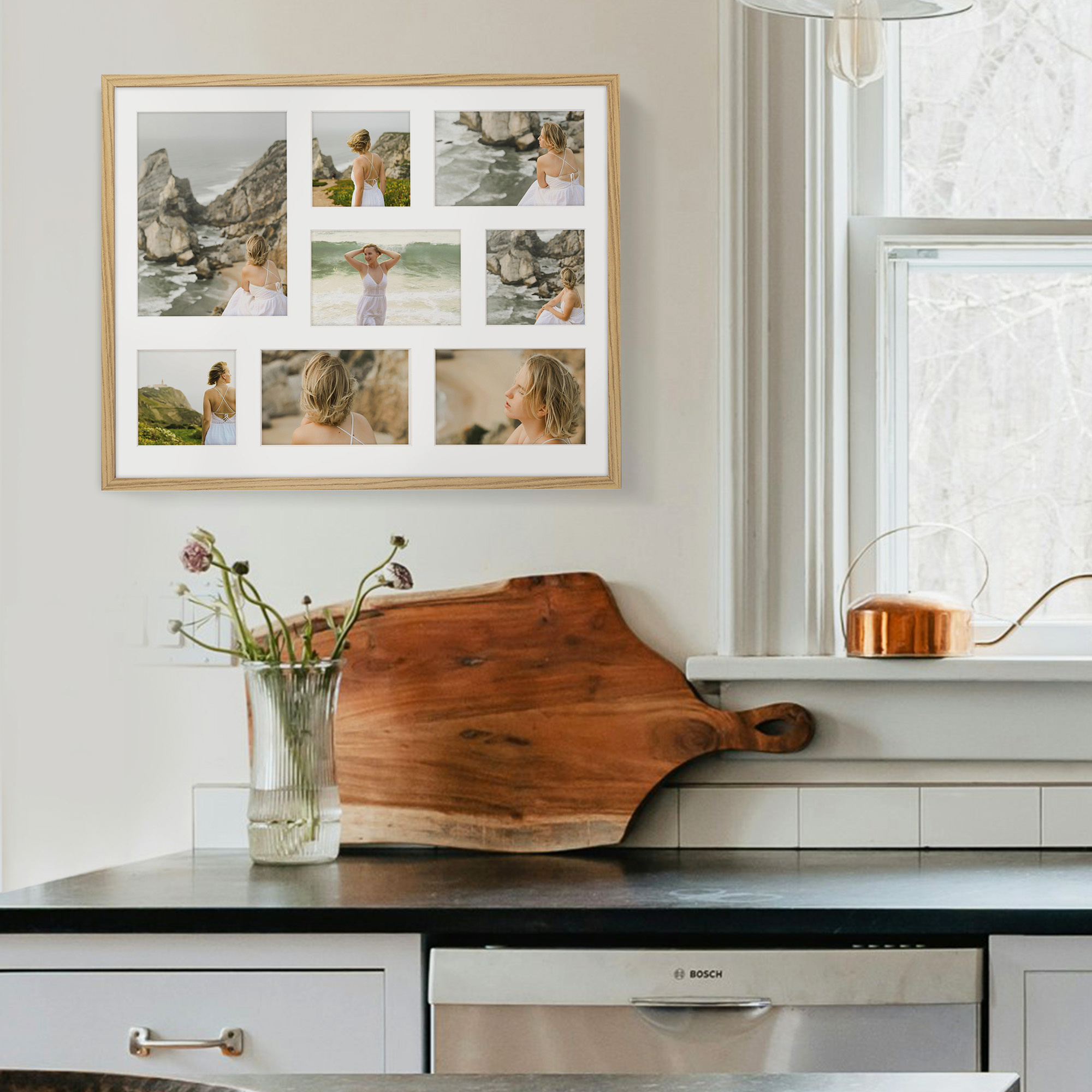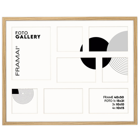 Ramka na 8 zdjęć - Foto Galeria 40x50 cm (wymiar ramy wewnętrzny) w kolorze dębowym odpowiednia do oprawy ośmiu zdjęć: 3x 10x10 cm, 4x 10x15 cm, 1x 15x21 cm. Kolor ramki dębowy z jasnym Passe Partout