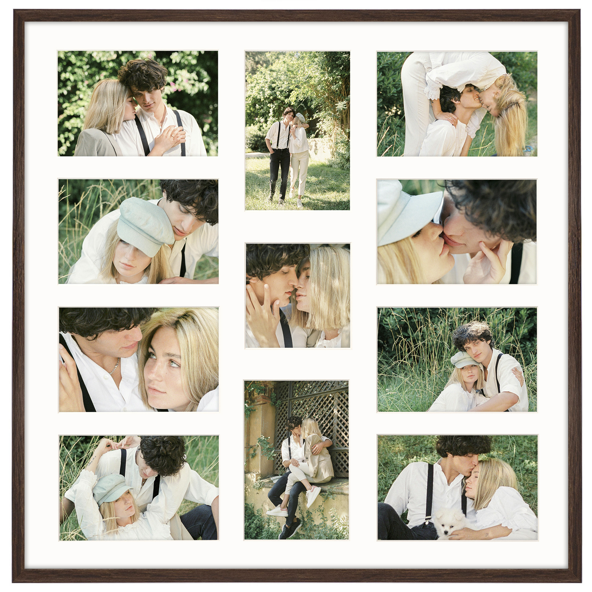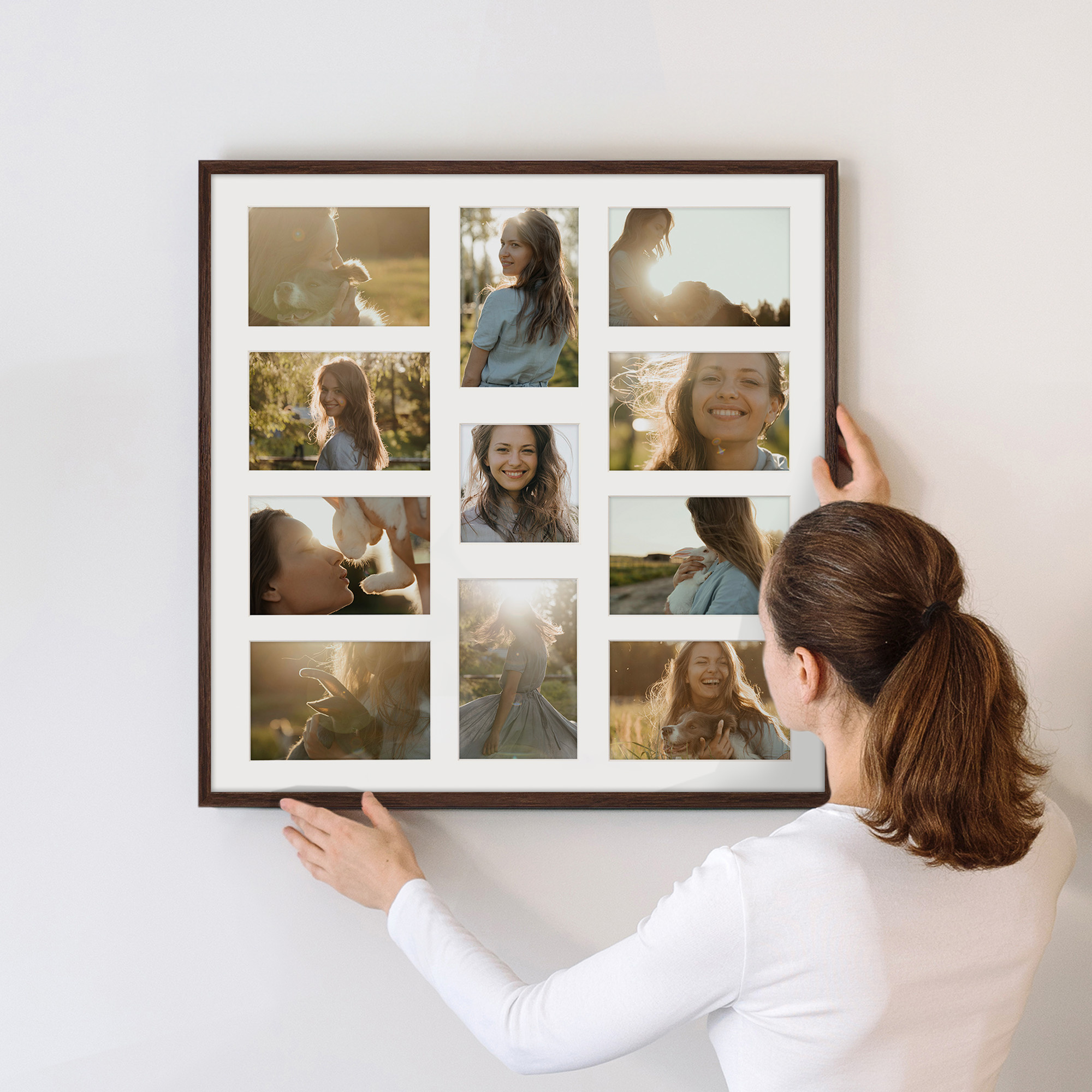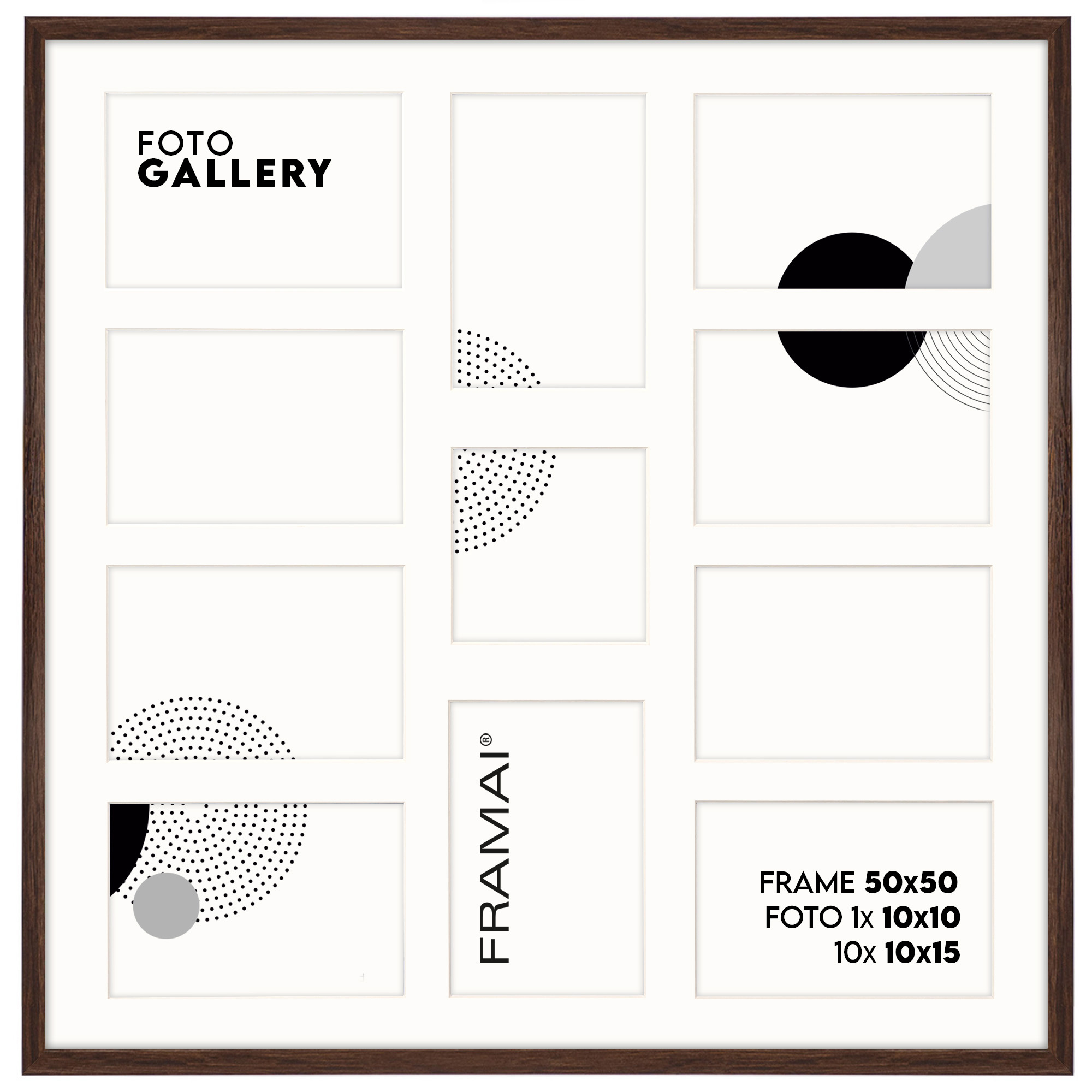 Ramka na 11 zdjęć - Foto Galeria 50x50 cm (wymiar ramy wewnętrzny) w kolorze brązowym odpowiednia do oprawy jedenastu zdjęć o formatach 10x15 cm i 10x10 cm. Kolor ramki brązowy z jasnym Passe Partout