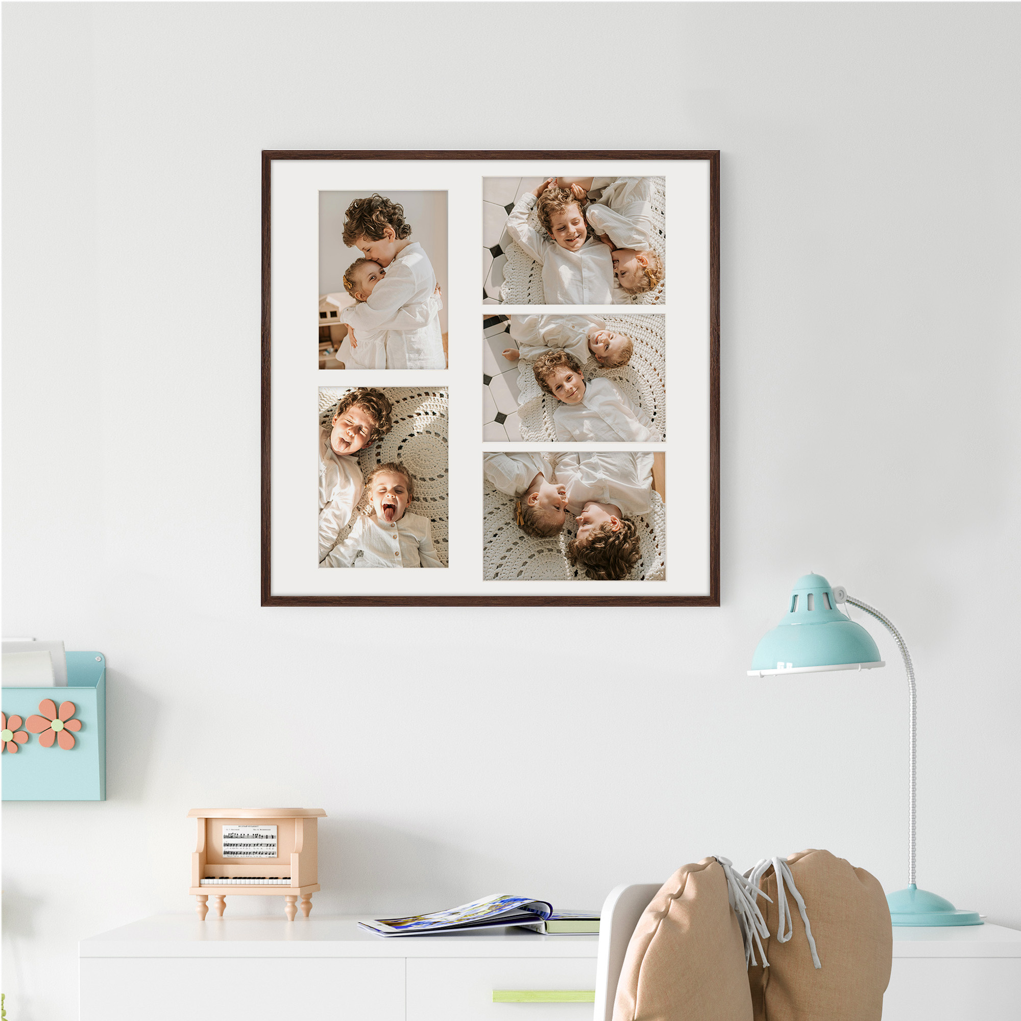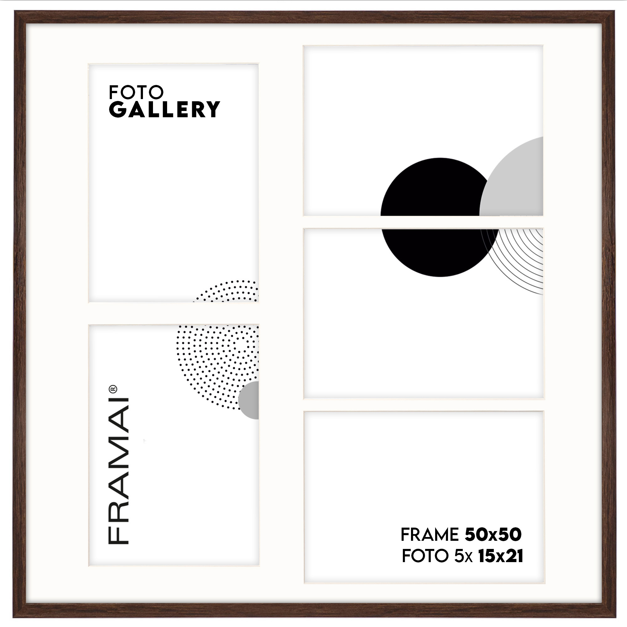 Ramka na 5 zdjęć - Foto Galeria 50x50 cm (wymiar ramy wewnętrzny) w kolorze brązowym odpowiednia do oprawy pięciu zdjęć o formacie 15x21 cm. Kolor ramki brązowy z jasnym Passe Partout