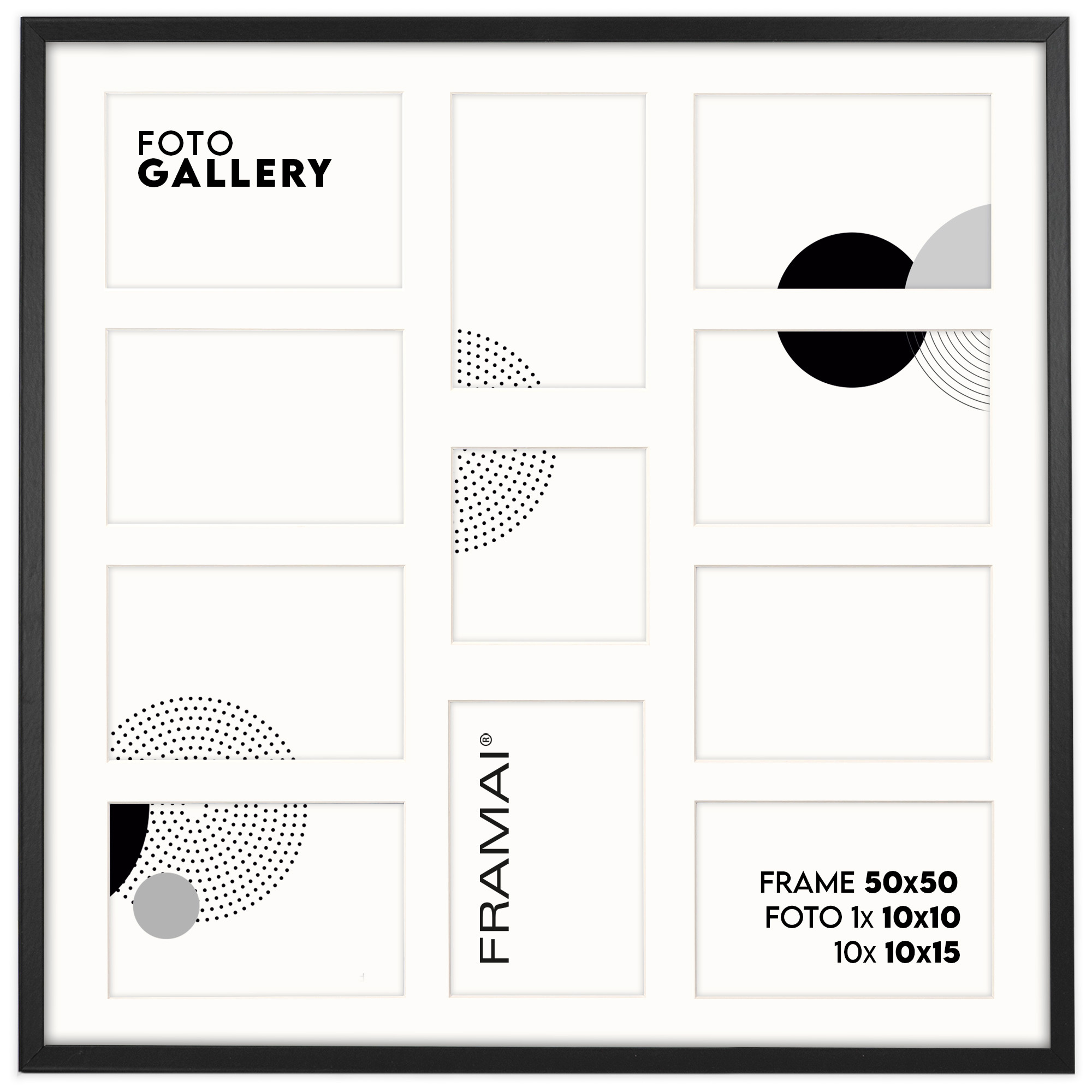 Ramka na 11 zdjęć - Foto Galeria 50x50 cm (wymiar ramy wewnętrzny) w kolorze czarnym odpowiednia do oprawy jedenastu zdjęć o formatach 10x15 cm i 10x10 cm. Kolor ramki czarny z jasnym Passe Partout