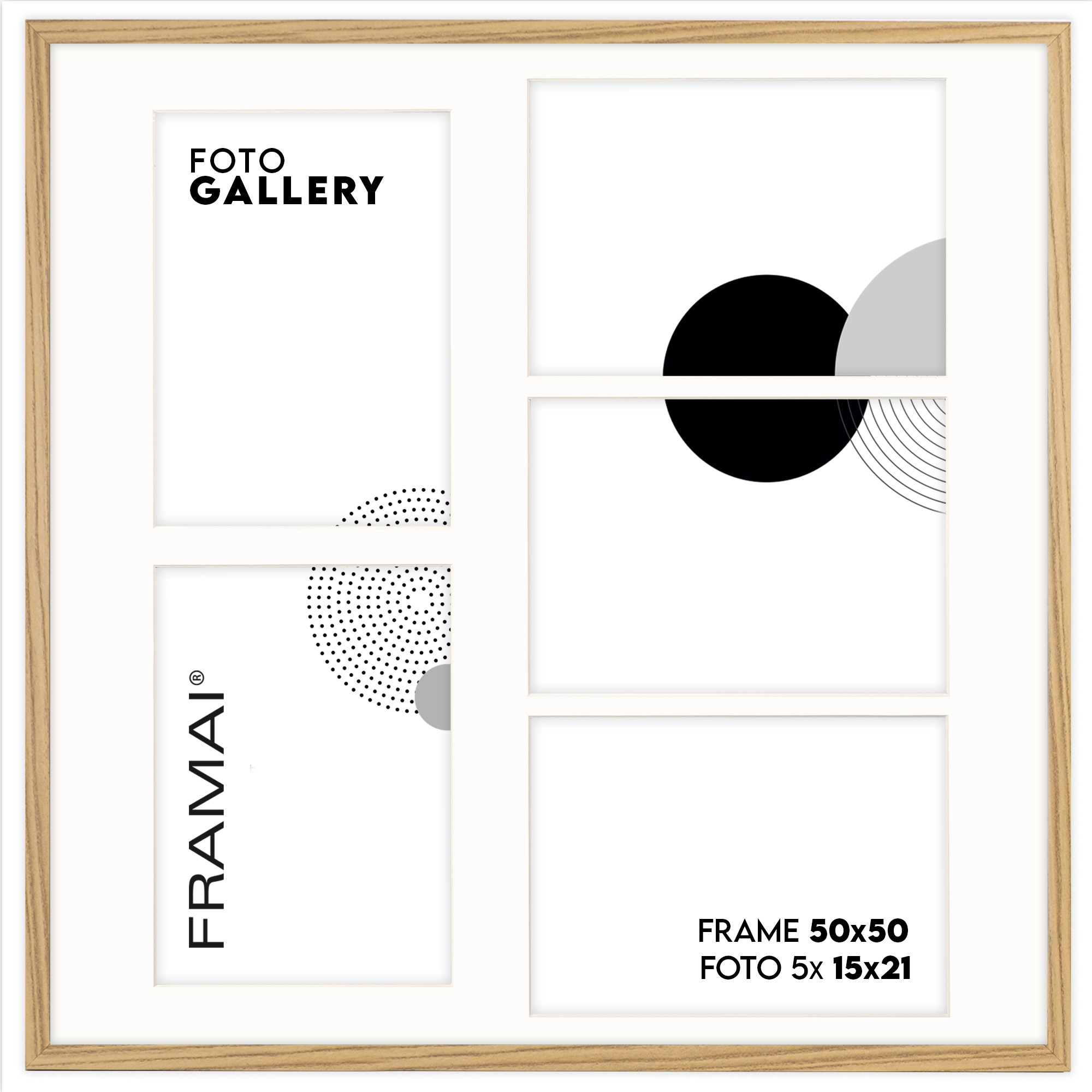 Ramka na 5 zdjęć - Foto Galeria 50x50 cm (wymiar ramy wewnętrzny) w kolorze dębowym odpowiednia do oprawy pięciu zdjęć o formacie 15x21 cm. Kolor ramki dębowy z jasnym Passe Partout