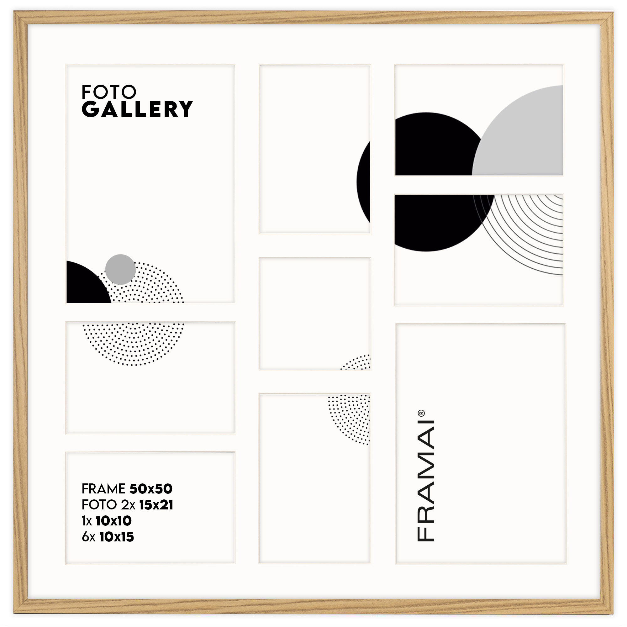 Ramka na 9 zdjęć - Foto Galeria 50x50 cm (wymiar ramy wewnętrzny) w kolorze dębowym odpowiednia do oprawy dziewięciu zdjęć o formatach 10x15 cm, 15x21 cm i 10x10 cm. Kolor ramki dębowy z jasnym Passe Partout
