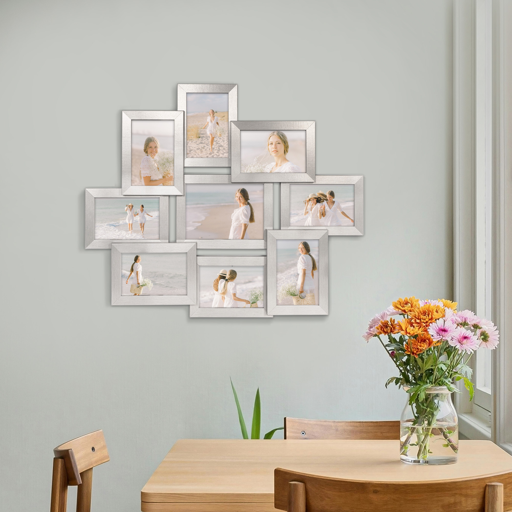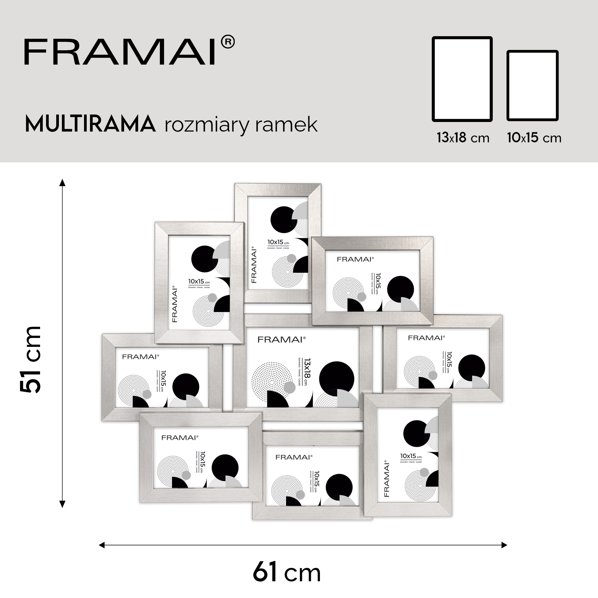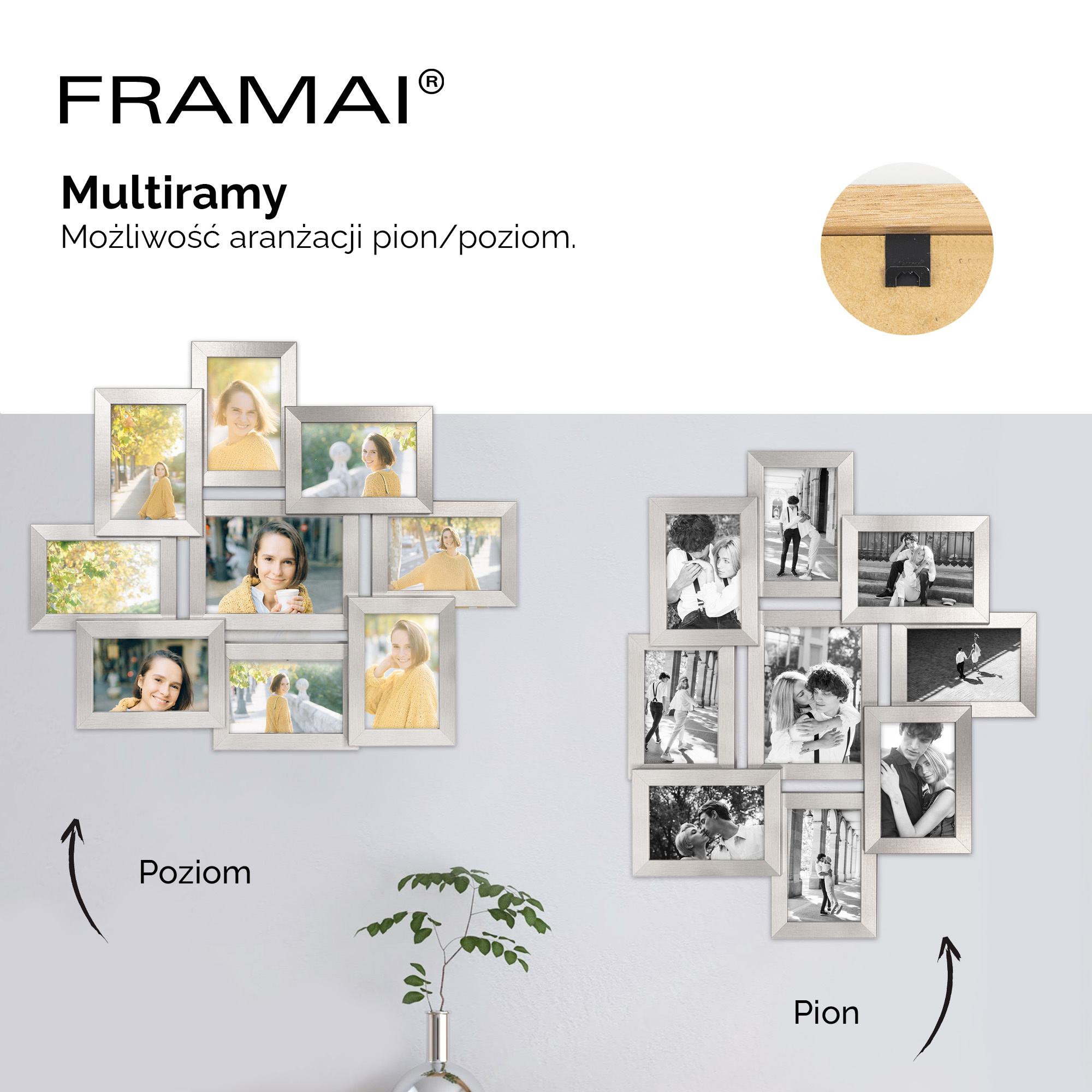 Multirama HEN S to elegancka oprawa na 8 zdjęć o wymiarach 10x15 cm i 1 zdjęcie 13x18 cm. Wykonana z MDF z prostym, satynowym wykończeniem w eleganckim srebrnym kolorze, stanowi idealną propozycję do stworzenia stylowej galerii rodzinnej lub wyeksponowania wyjątkowych wspomnień z wakacji. Każda multirama jest wykonana w 100% z ekologicznego MDF, wyposażona w bezbarwne plexi organiczne oraz twarde plecy z płyty HDF, co zapewnia trwałość i stabilność konstrukcji.