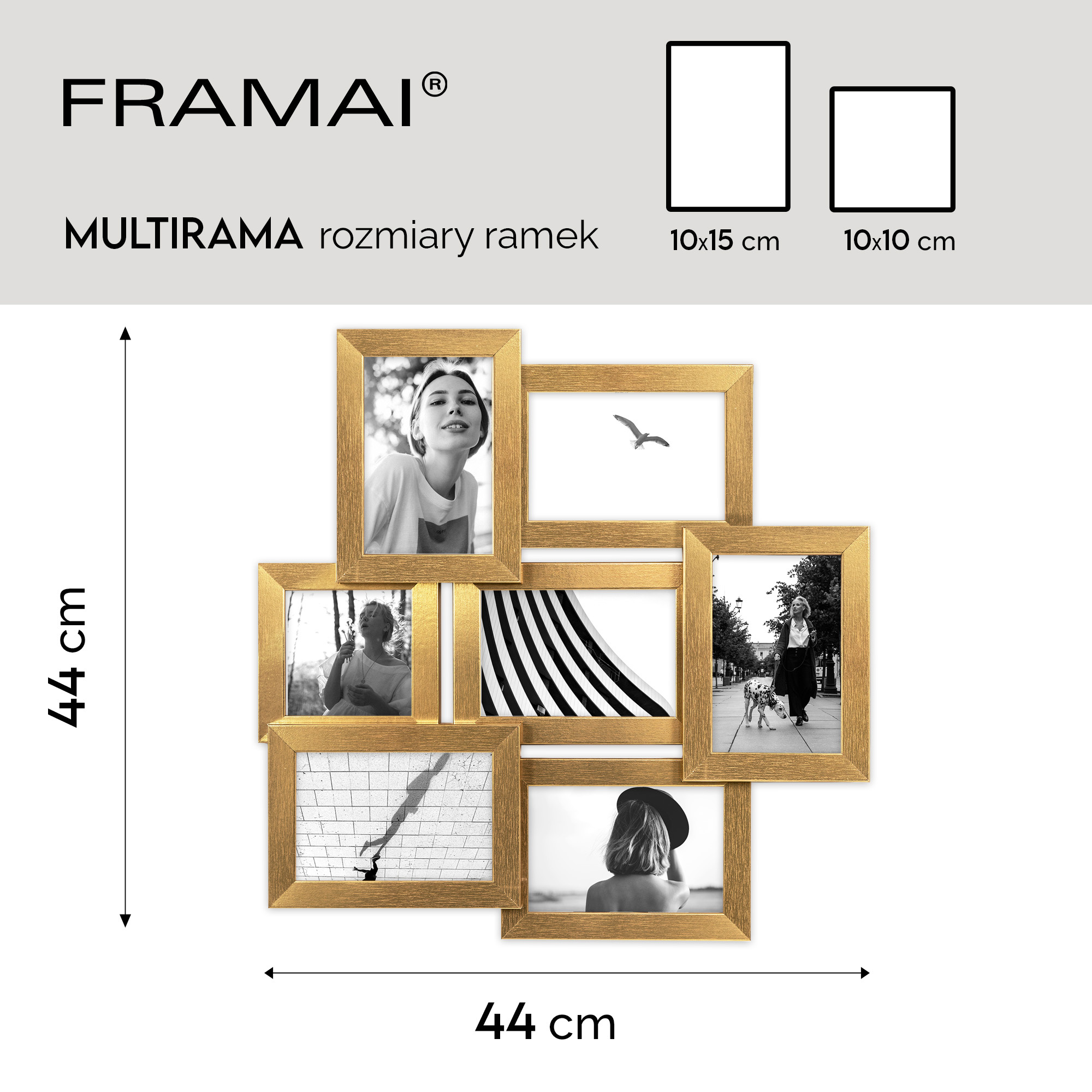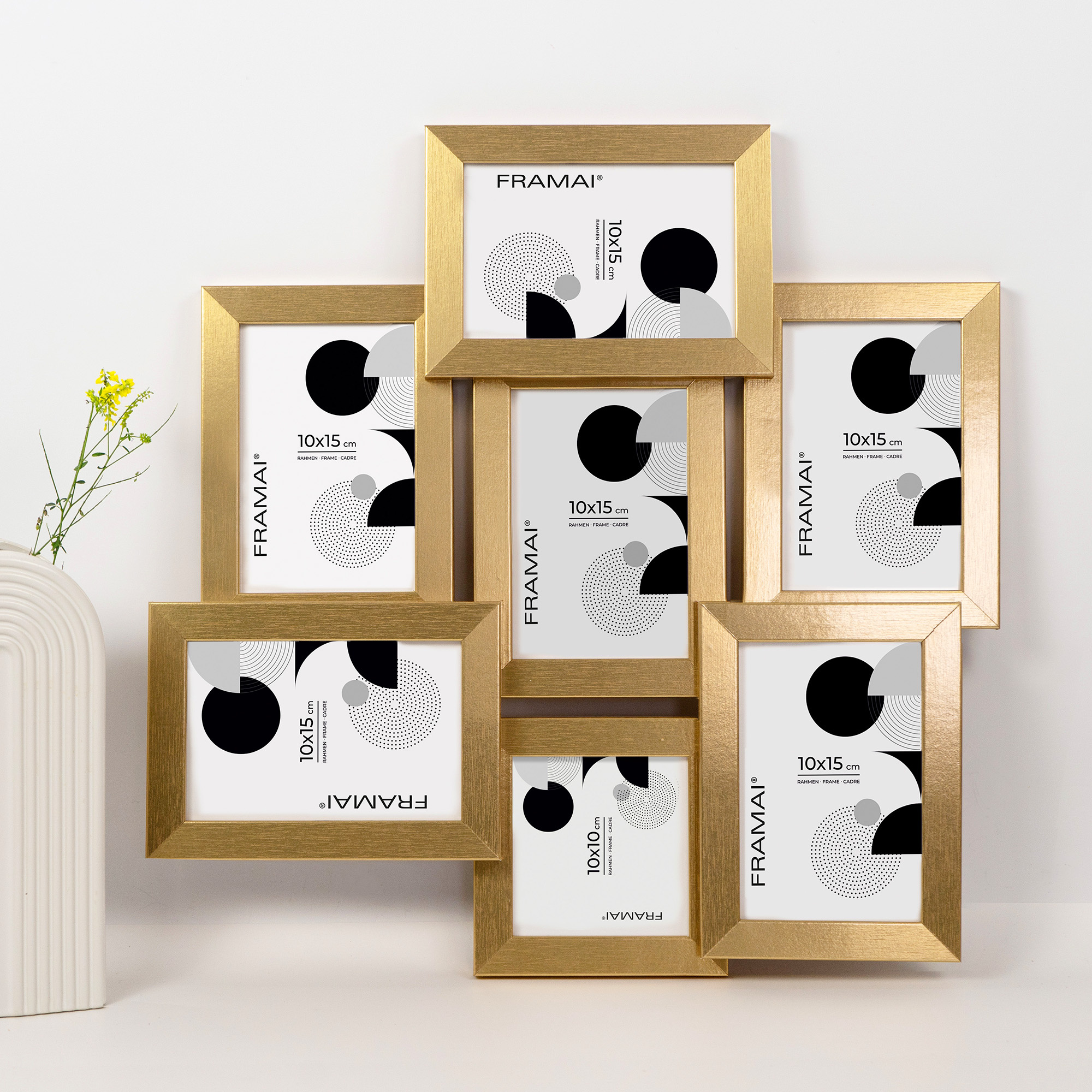 Multirama HEN Z to elegancka oprawa na 6 zdjęć o wymiarach 10x15 cm i 1 zdjęcie o wymiarach 10x10 cm. Wykonana z MDF z prostym, satynowym wykończeniem w eleganckim złotym kolorze, stanowi idealną propozycję do stworzenia stylowej galerii rodzinnej lub wyeksponowania wyjątkowych wspomnień z wakacji. Każda multirama jest wykonana w 100% z ekologicznego MDF, wyposażona w bezbarwne plexi organiczne oraz twarde plecy z płyty HDF, co zapewnia trwałość i stabilność konstrukcji.