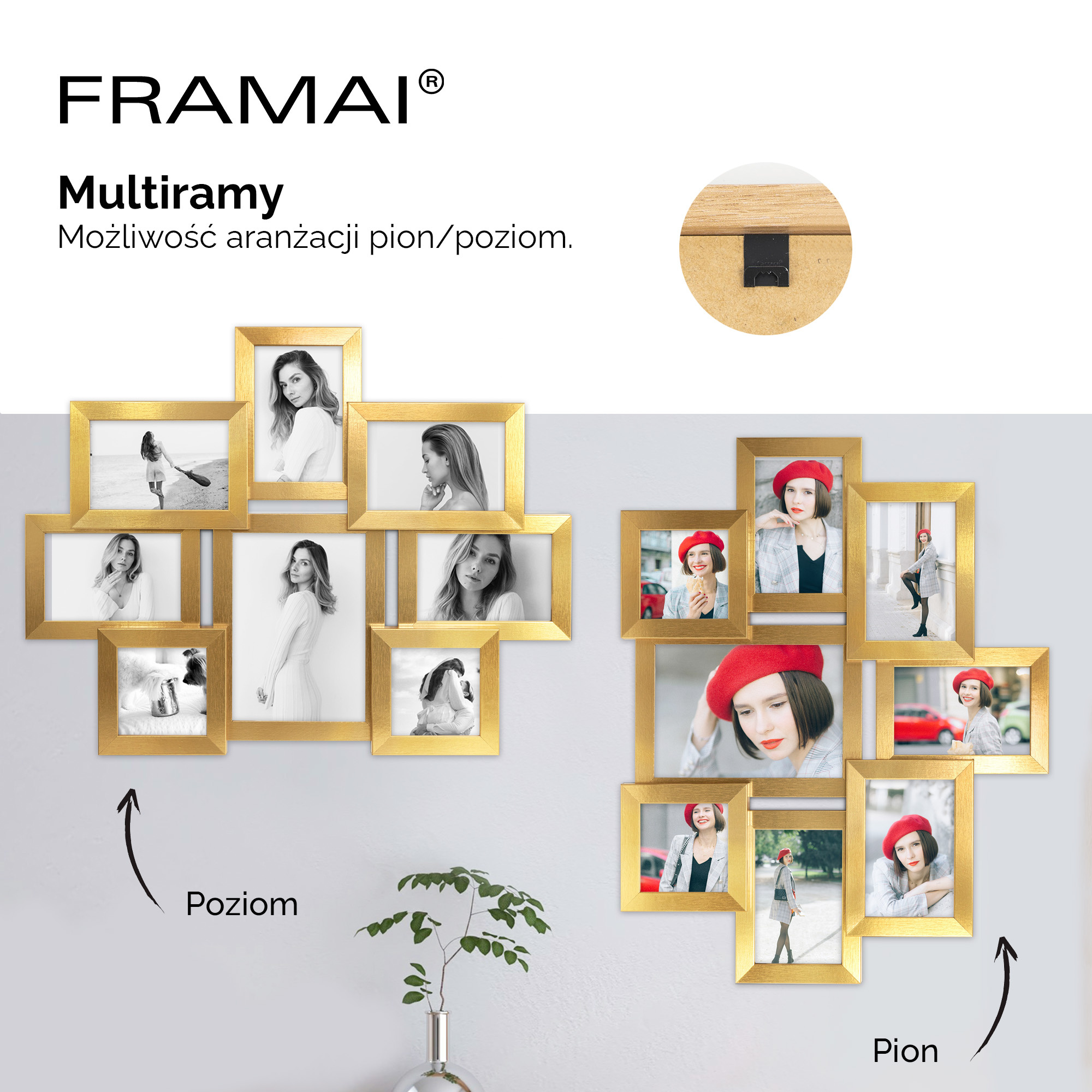 Multirama HEN Z to elegancka oprawa na 5 zdjęć o wymiarach 10x15 cm, 2 zdjęcia 10x10 cm i 1 zdjęcie 15x21 cm. Wykonana z MDF z prostym, satynowym wykończeniem w eleganckim złotym kolorze, stanowi idealną propozycję do stworzenia stylowej galerii rodzinnej lub wyeksponowania wyjątkowych wspomnień z wakacji. Każda multirama jest wykonana w 100% z ekologicznego MDF, wyposażona w bezbarwne plexi organiczne oraz twarde plecy z płyty HDF, co zapewnia trwałość i stabilność konstrukcji.