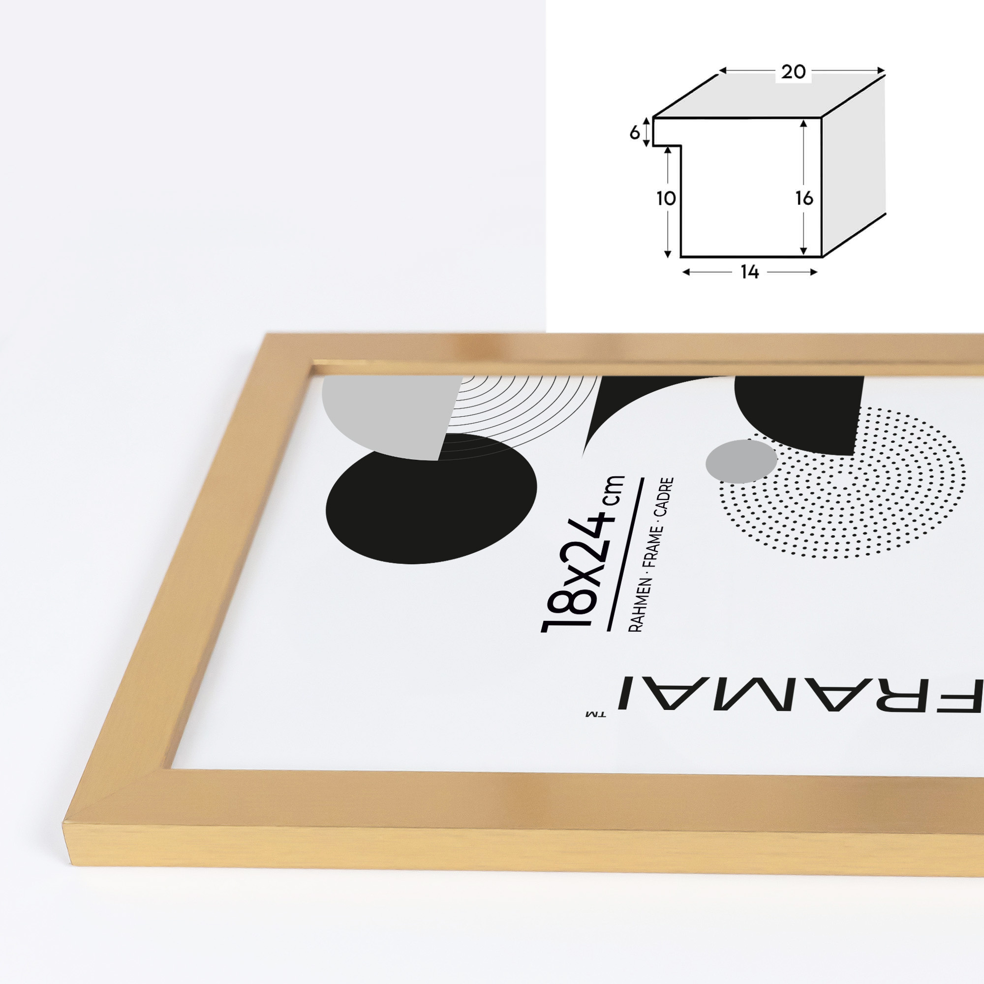 Ramka precyzyjnie wykonana z EKO MDF w kolorze złotym. Modna stylistyka i widoczna rama 20 mm przykuje uwagę każdej osoby. Świetnie spisze się do oprawy plakatów, grafik i zdjęć.
