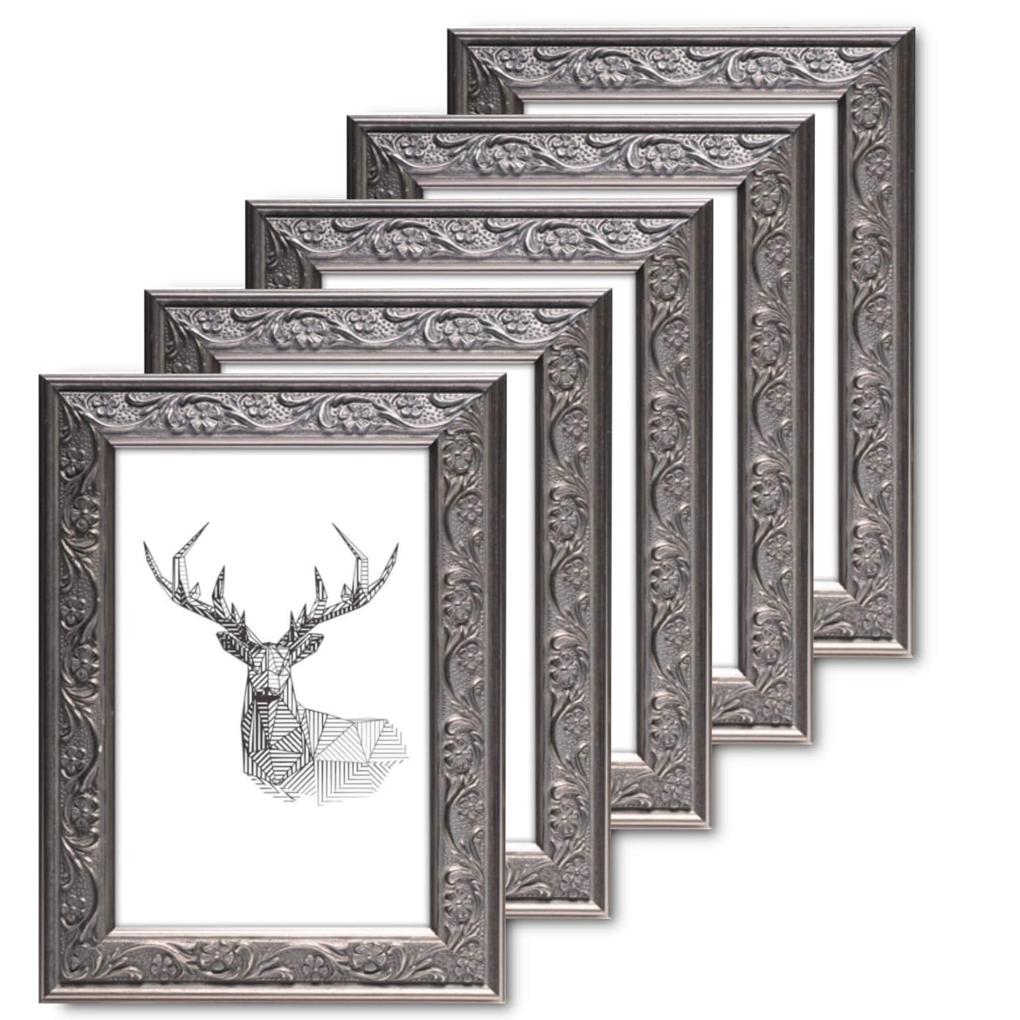 Fotoramki wykonane z tworzywa w kolorze czarnym z ornamentami o przekroju profilu 22x16 mm. Pakiet ramek jest doskonałą propozycją do ekonomicznej oprawy zdjęć, rysunków, druków. Ramki pakowane są w zestawie po 5 szt. Wyposażone są w szkło mineralne. Plecki wykonane są z twardej płyty HDF. Ramki na zdjęcia do rozmiaru 18x24 cm dodatkowo posiadają stopkę / nóżkę która pozwala eksponować oprawiony obraz na biurku lub regale. Pakiet ramek MIX S 2 PAK dostępny jest w rozmiarach od 10x15 cm do 15x21 cm.