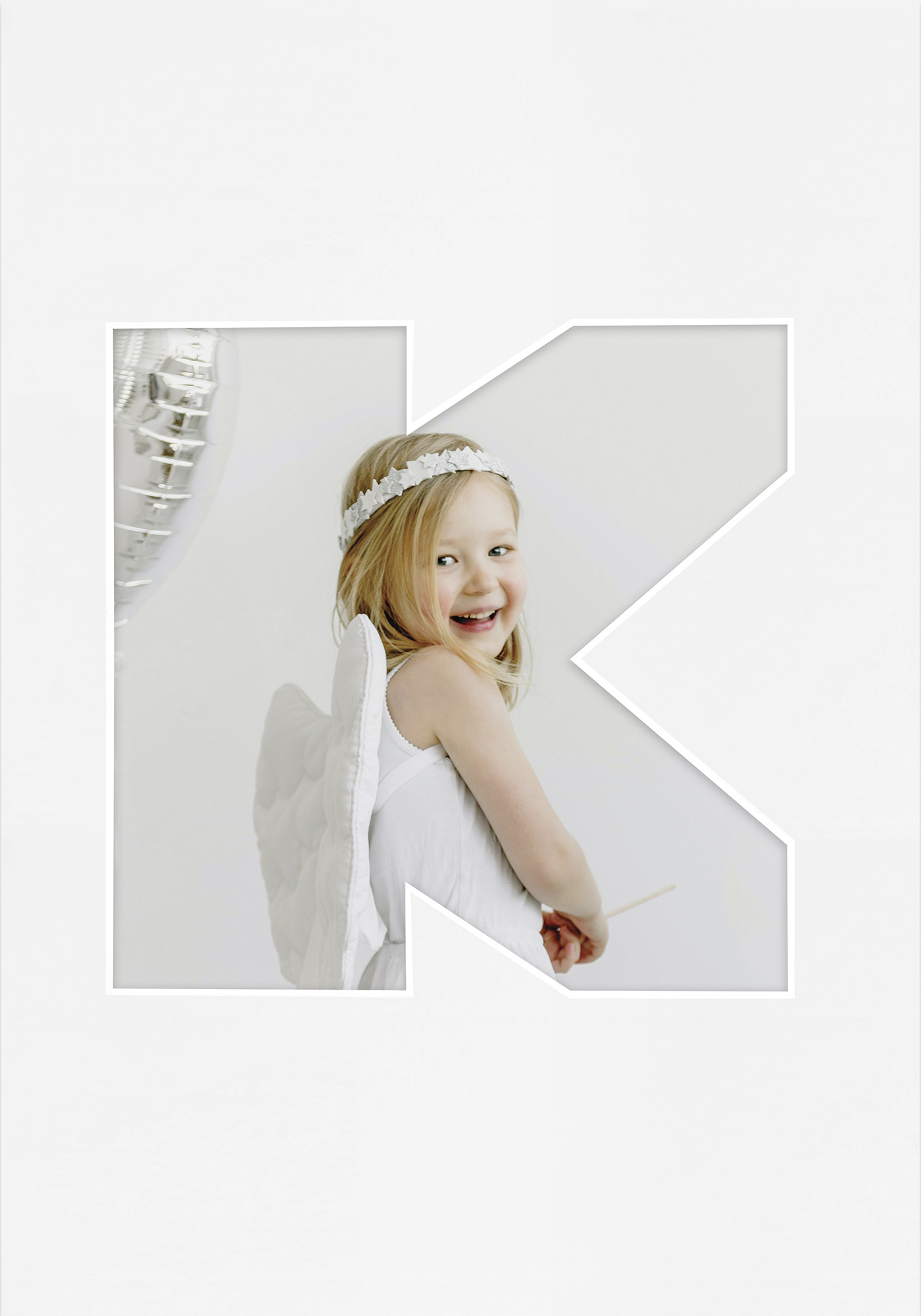 Przygotowaliśmy specjalną serię passe partout ABC - standardowe kształty zostały zamienione na spersonalizowane litery alfabetu od A do Z. Białe passe partout pasuje do ramek w rozmiarze 21x30 cm.