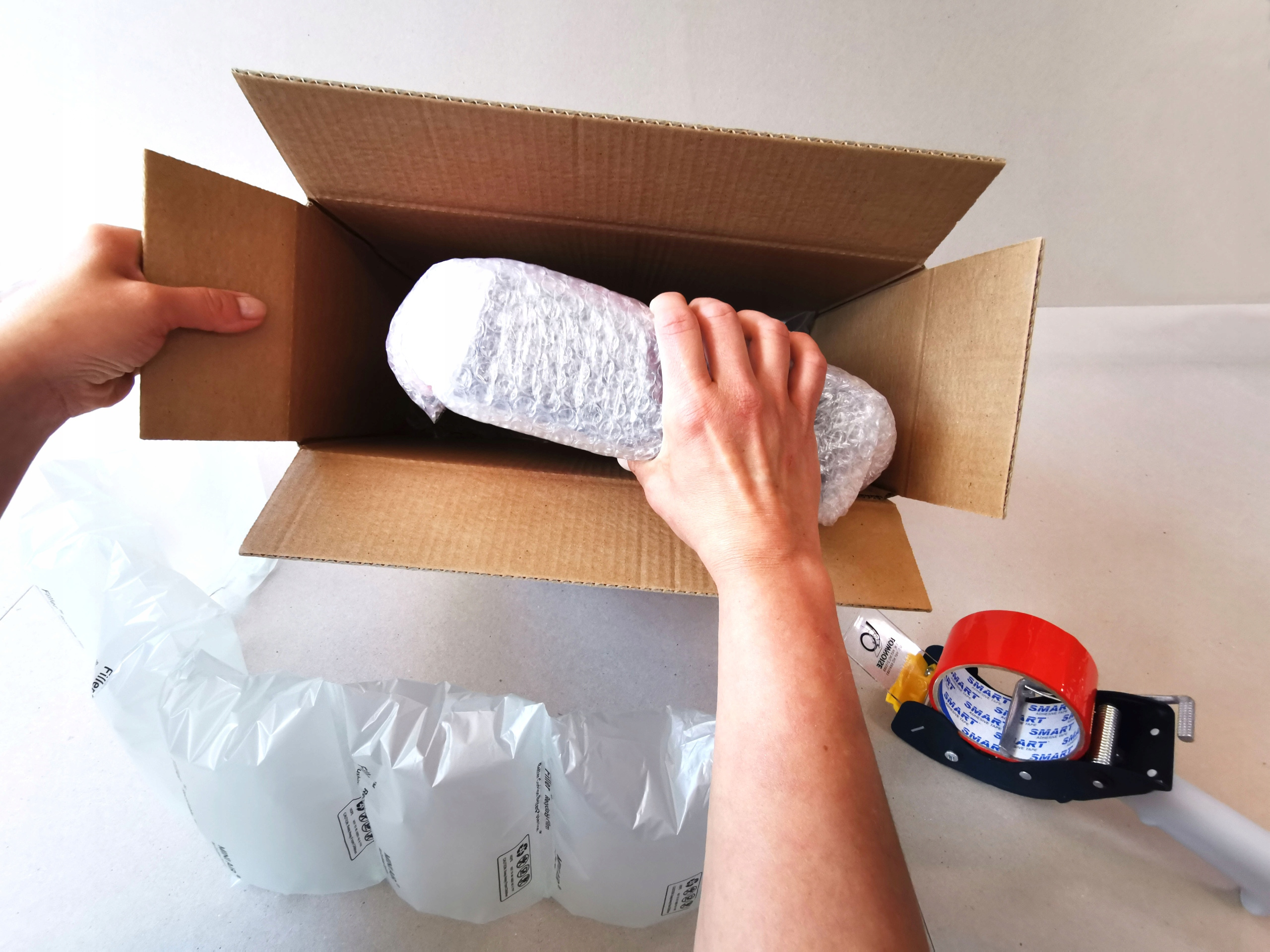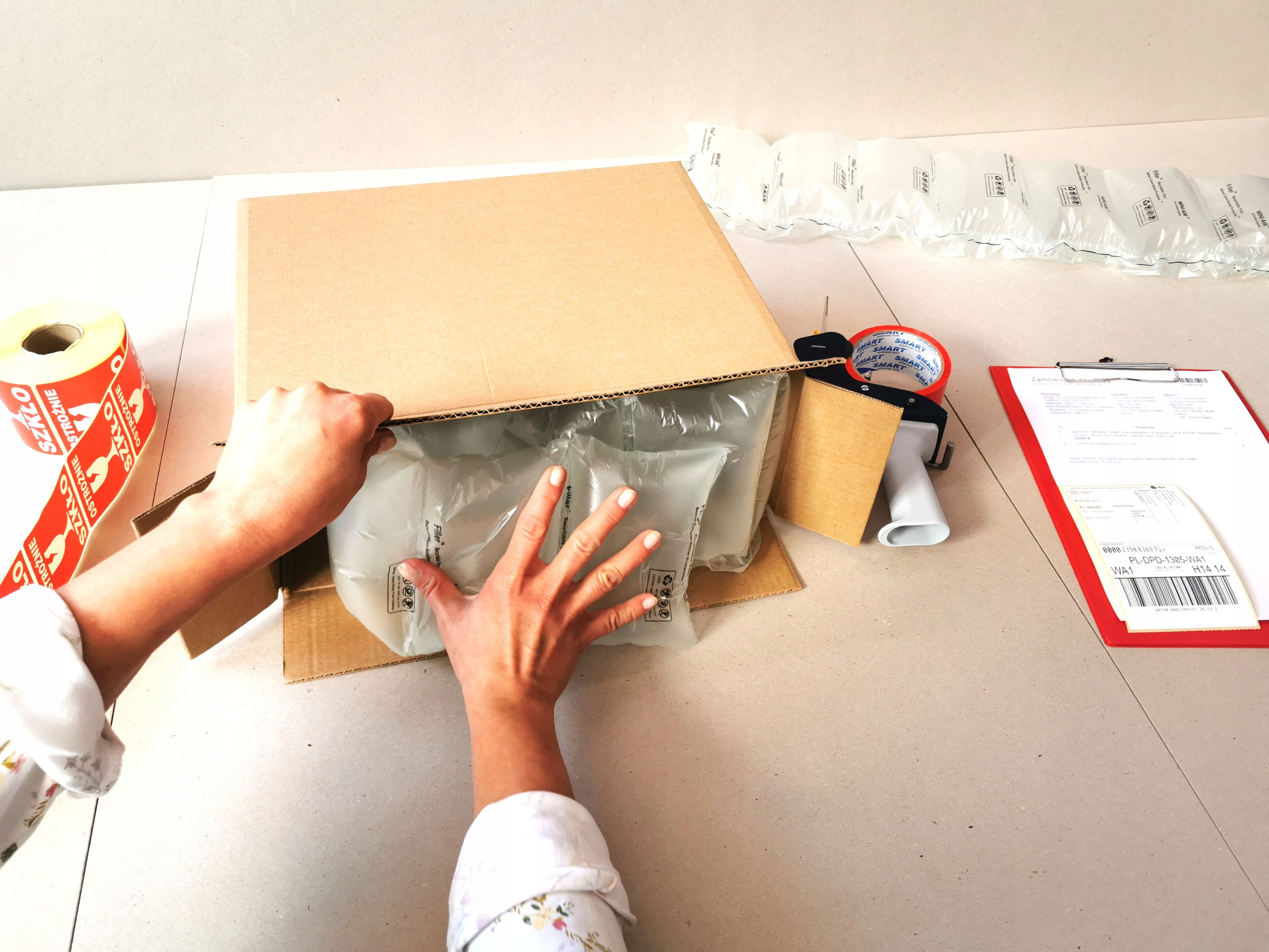 - Jako wypełniaczy używamy specjalnie pompowanych poduszek, które dodatkowo amortyzują zawartość paczki.