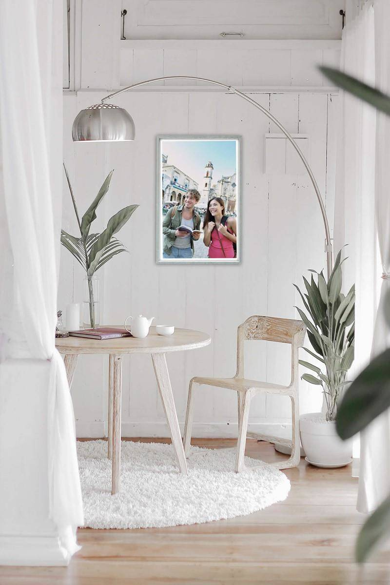 Nowoczesna fotoramka w srebrnym kolorze o przekroju profilu 13x15 mm wykonana w 100% z drewna. Przeznaczona jest do oprawy fotografii, plakatów i dyplomów. W zależności od formatu wyposażona jest w szkło mineralne lub bezbarwne szkło organiczne - wysokiej jakości plexi. Plecki wykonane są z twardej płyty HDF. Ramki na zdjęcia do rozmiaru 18x24 cm dodatkowo posiadają stopkę / nóżkę która pozwala eksponować oprawiony obraz na biurku lub regale. Ramka drewniana AGA A S4 dostępna jest w rozmiarach od 10x15 cm do 40x50 cm.