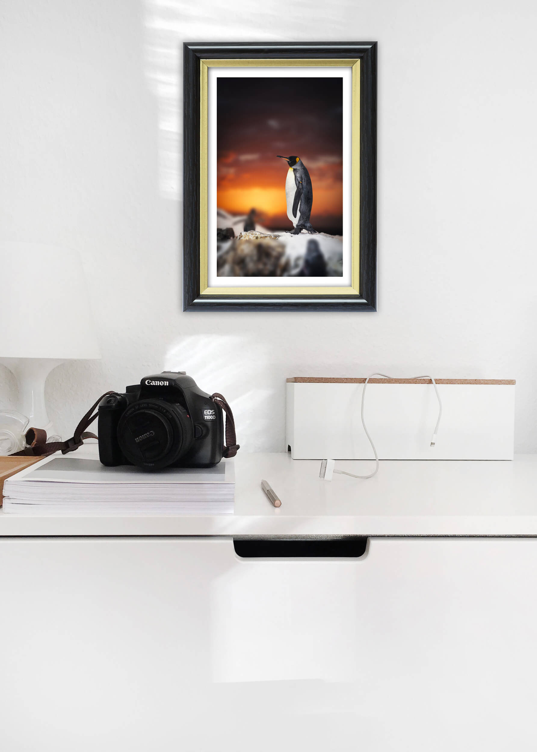 Klasyczna fotoramka w kolorze wenge ze złotym paskiem o przekroju profilu 16x16 mm wykonana w 100% z drewna. Przeznaczona jest do oprawy fotografii, plakatów i dyplomów. W zależności od formatu wyposażona jest w szkło mineralne lub bezbarwne szkło organiczne - wysokiej jakości plexi. Plecki wykonane są z twardej płyty HDF. Ramki na zdjęcia do rozmiaru 18x24 cm dodatkowo posiadają stopkę / nóżkę która pozwala eksponować oprawiony obraz na biurku lub regale. Ramka drewniana DRI CL 22 dostępna jest w rozmiarach od 10x15 cm do 40x50 cm.