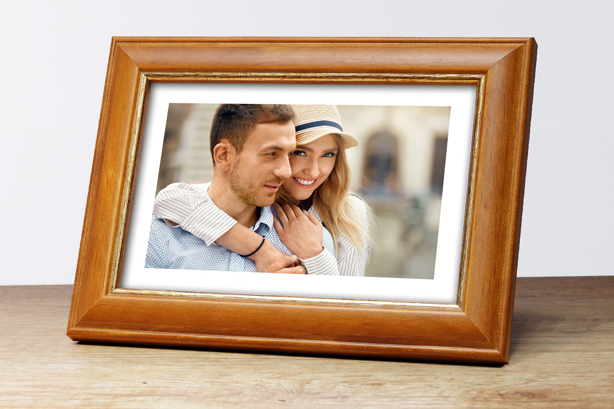 Delikatnie profilowana fotoramka w brązowym kolorze ze złotym paskiem o przekroju profilu 22x15 mm wykonana w 100% z drewna. Przeznaczona jest do oprawy fotografii, plakatów i dyplomów. W zależności od formatu wyposażona jest w szkło mineralne lub bezbarwne szkło organiczne - wysokiej jakości plexi. Plecki wykonane są z twardej płyty HDF. Ramki na zdjęcia do rozmiaru 18x24 cm dodatkowo posiadają stopkę / nóżkę która pozwala eksponować oprawiony obraz na biurku lub regale. Ramka drewniana DRI S 10 dostępna jest w rozmiarach od 10x15 cm do 50x70 cm.