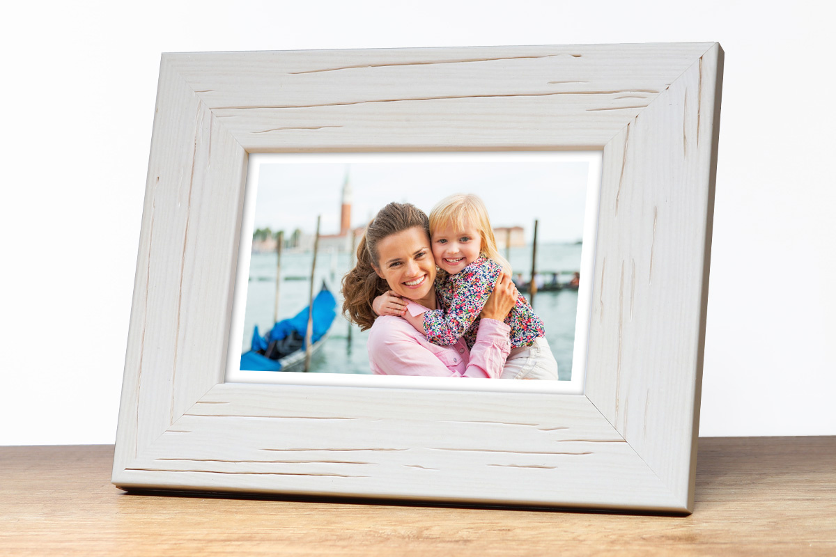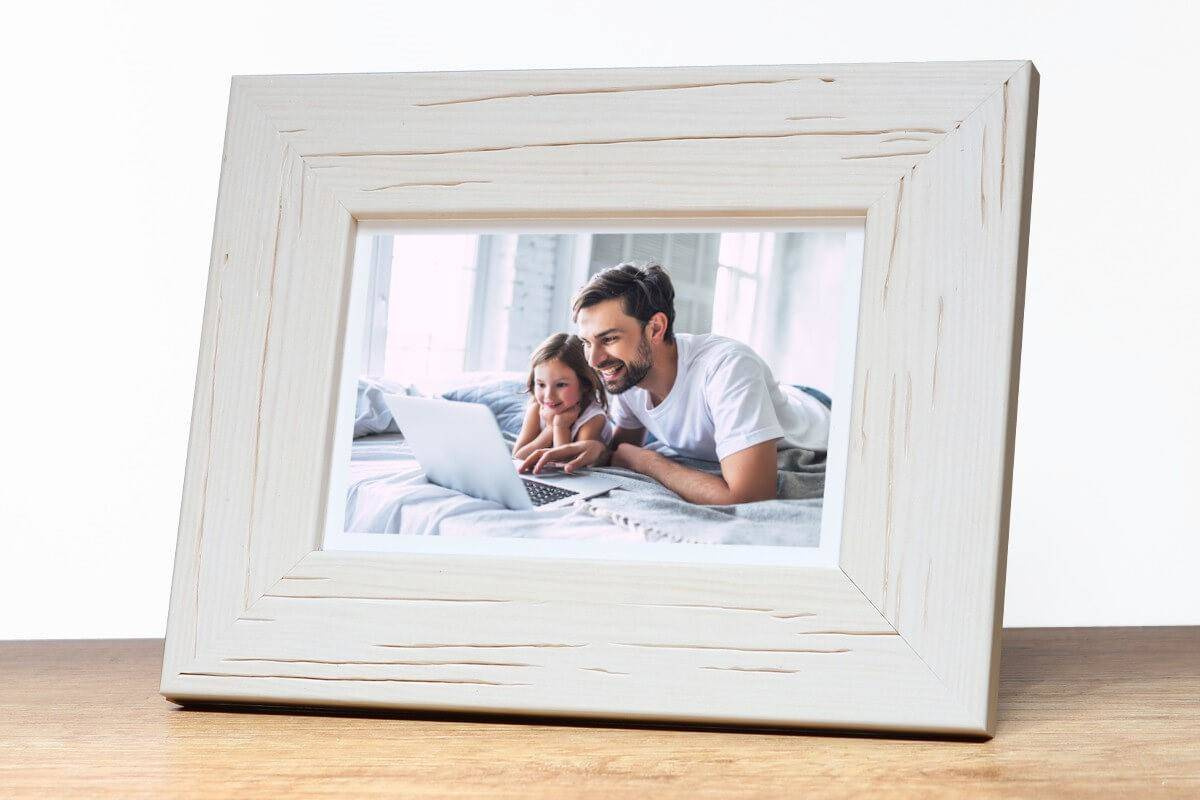 Nowoczesna fotoramka w białym kolorze z widoczną strukturą drewna o przekroju profilu 40x12 mm wykonana w 100% z drewna. Przeznaczona jest do oprawy fotografii, plakatów i dyplomów. W zależności od formatu wyposażona jest w szkło mineralne lub bezbarwne szkło organiczne - wysokiej jakości plexi. Plecki wykonane są z twardej płyty HDF. Ramki na zdjęcia do rozmiaru 18x24 cm dodatkowo posiadają stopkę / nóżkę która pozwala eksponować oprawiony obraz na biurku lub regale. Ramka drewniana DRL A 1 dostępna jest w rozmiarach od 10x15 cm do 50x70 cm.