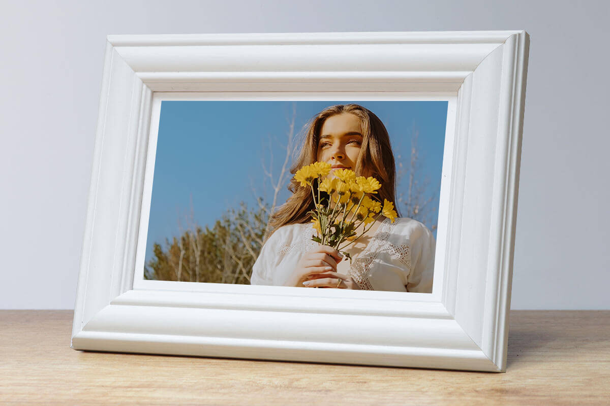 Klasyczna fotoramka w białym kolorze o przekroju profilu 27x15 mm wykonana w 100% z drewna. Przeznaczona jest do oprawy fotografii, plakatów i dyplomów. W zależności od formatu wyposażona jest w szkło mineralne lub bezbarwne szkło organiczne - wysokiej jakości plexi. Plecki wykonane są z twardej płyty HDF. Ramki na zdjęcia do rozmiaru 18x24 cm dodatkowo posiadają stopkę / nóżkę która pozwala eksponować oprawiony obraz na biurku lub regale. Ramka drewniana DRL F 1 dostępna jest w rozmiarach od 10x15 cm do 50x70 cm.