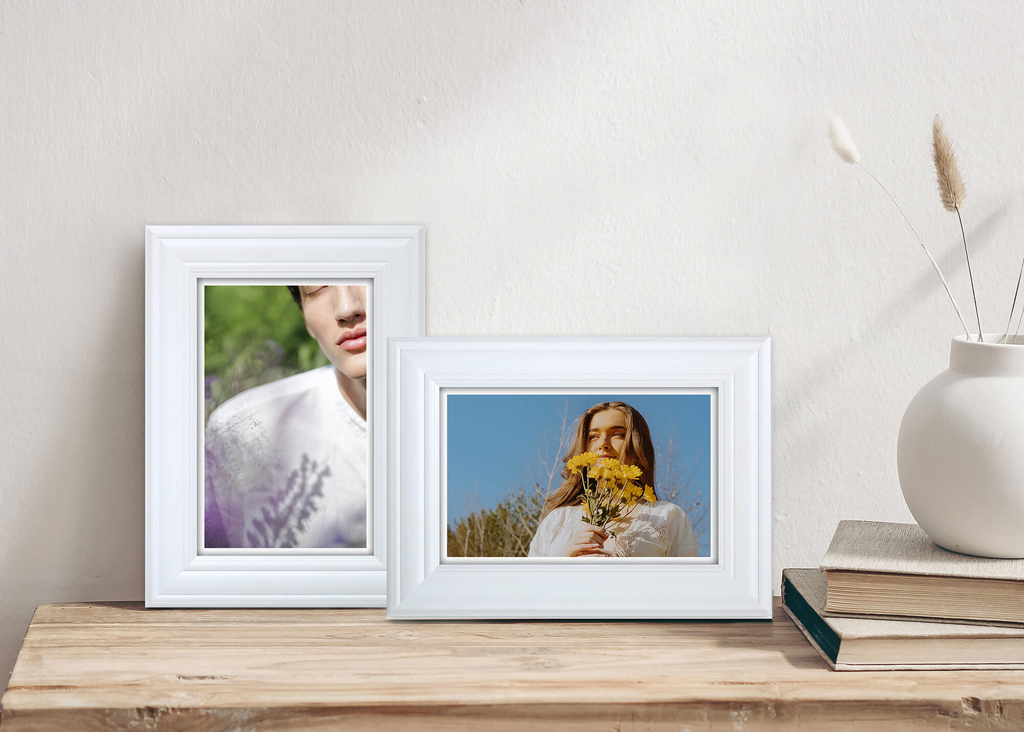 Klasyczna fotoramka w białym kolorze o przekroju profilu 27x15 mm wykonana w 100% z drewna. Przeznaczona jest do oprawy fotografii, plakatów i dyplomów. W zależności od formatu wyposażona jest w szkło mineralne lub bezbarwne szkło organiczne - wysokiej jakości plexi. Plecki wykonane są z twardej płyty HDF. Ramki na zdjęcia do rozmiaru 18x24 cm dodatkowo posiadają stopkę / nóżkę która pozwala eksponować oprawiony obraz na biurku lub regale. Ramka drewniana DRL F 1 dostępna jest w rozmiarach od 10x15 cm do 50x70 cm.