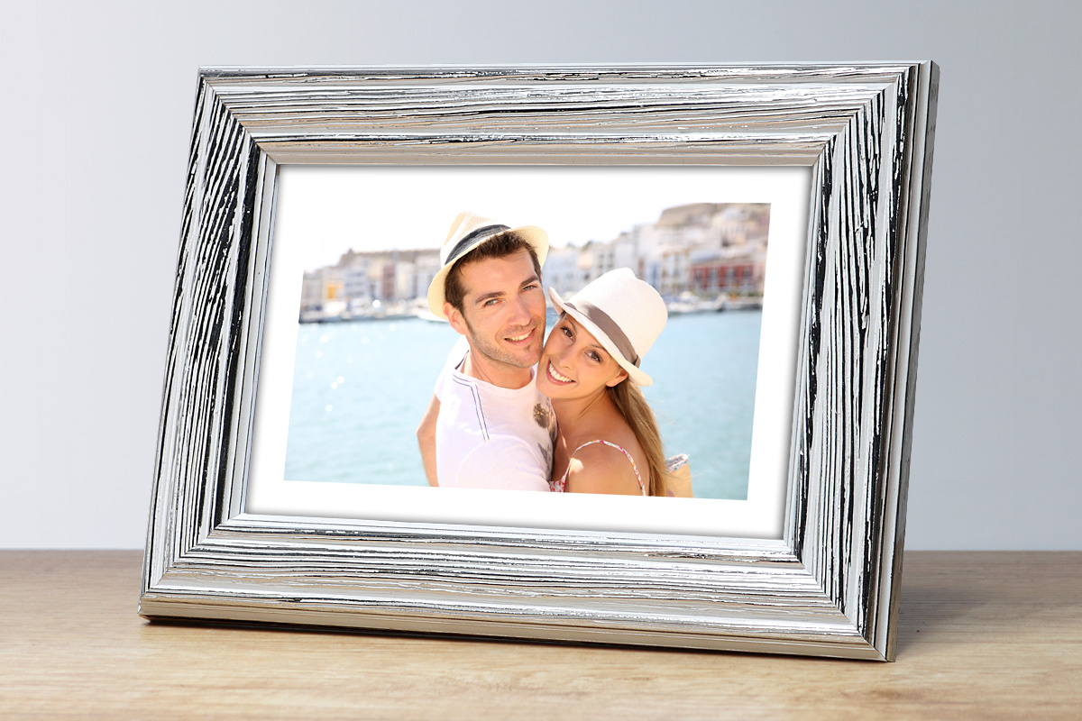 Klasyczna fotoramka w białym kolorze z ciemnymi przetarciami o przekroju profilu 27x15 mm wykonana w 100% z drewna. Przeznaczona jest do oprawy fotografii, plakatów i dyplomów. W zależności od formatu wyposażona jest w szkło mineralne lub bezbarwne szkło organiczne - wysokiej jakości plexi. Plecki wykonane są z twardej płyty HDF. Ramki na zdjęcia do rozmiaru 18x24 cm dodatkowo posiadają stopkę / nóżkę która pozwala eksponować oprawiony obraz na biurku lub regale. Ramka drewniana DRL F 1S dostępna jest w rozmiarach od 10x15 cm do 50x70 cm.