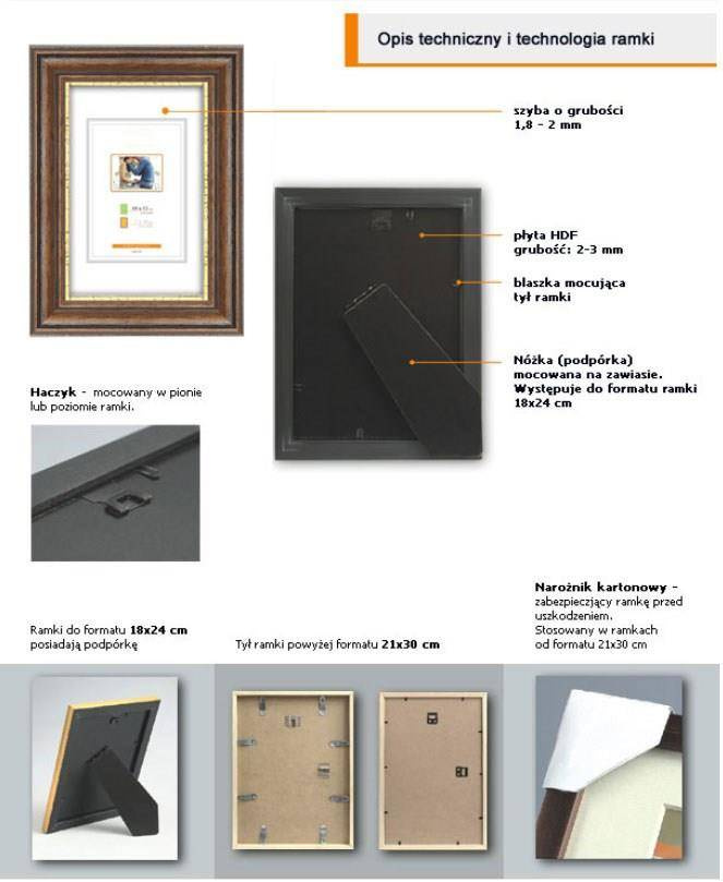 Ramka: z drewna sosnowego. Przód oprawy: szkło mineralne, o grubości 2 mm występuje do formatu 30x40 (włącznie)  / powyżej szkło organiczne 2 mm - plexi. Tył oprawy: wykonany jest z twardej płyty HDF o grubości 3 mm. Blaszki mocujące: miękkie blaszki mocujące tył ramki, zapewniają możliwość wielokrotnego otwierania. Ramka z podpórką: stopka występuje do formatu 18x24 cm umożliwia postawienie w pionie lub poziomie. Wieszak: stabilna metalowa zawieszka z możliwością ekspozycji pionowo lub poziomo. Opakowanie: ramki posiadają zabezpieczające narożniki tekturowe oraz folię ochronną. Gwarancja satysfakcji: Najwyższa jakość, gatunek I. Produkt polski.