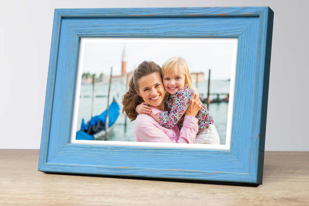 Nowoczesna fotoramka w błękitnym kolorze z przetarciami o przekroju profilu 25x16 mm wykonana w 100% z drewna. Przeznaczona jest do oprawy fotografii, plakatów i dyplomów. W zależności od formatu wyposażona jest w szkło mineralne lub bezbarwne szkło organiczne - wysokiej jakości plexi. Plecki wykonane są z twardej płyty HDF. Ramki na zdjęcia do rozmiaru 18x24 cm dodatkowo posiadają stopkę / nóżkę która pozwala eksponować oprawiony obraz na biurku lub regale. Ramka drewniana DRL M 11S dostępna jest w rozmiarach od 10x15 cm do 50x70 cm.