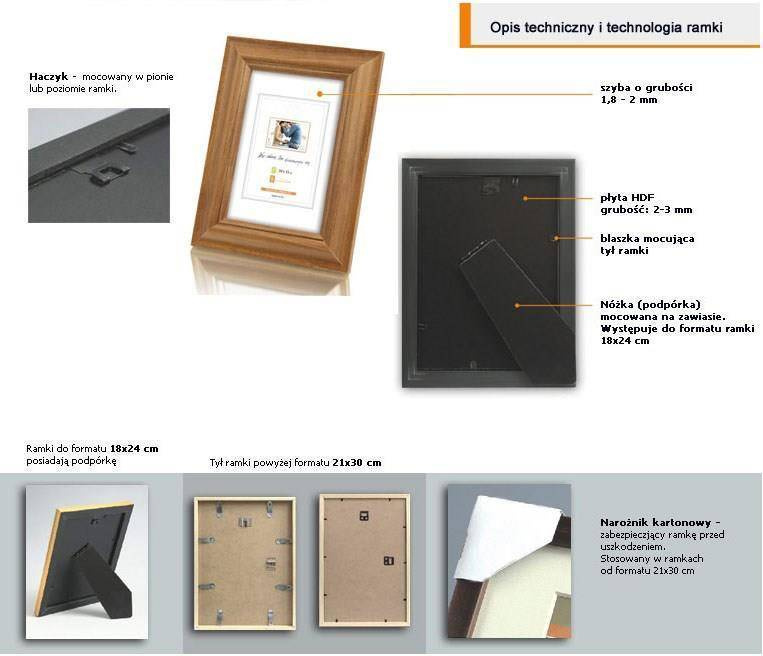 Ramka: z drewna sosnowego. Przód oprawy: szkło mineralne, o grubości 2 mm występuje do formatu 30x40 (włącznie)  / powyżej szkło organiczne 2 mm - plexi. Tył oprawy: wykonany jest z twardej płyty HDF o grubości 3 mm. Blaszki mocujące: miękkie blaszki mocujące tył ramki, zapewniają możliwość wielokrotnego otwierania. Ramka z podpórką: stopka występuje do formatu 18x24 cm umożliwia postawienie w pionie lub poziomie. Wieszak: stabilna metalowa zawieszka z możliwością ekspozycji pionowo lub poziomo. Opakowanie: ramki posiadają zabezpieczające narożniki tekturowe oraz folię ochronną. Gwarancja satysfakcji: Najwyższa jakość, gatunek I. Produkt polski.