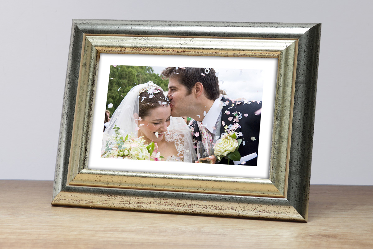 Klasyczna fotoramka w kolorze srebrnym ze złotym paskiem o przekroju profilu 29x14 mm wykonana w 100% z drewna. Przeznaczona jest do oprawy fotografii, plakatów i dyplomów. W zależności od formatu wyposażona jest w szkło mineralne lub bezbarwne szkło organiczne - wysokiej jakości plexi. Plecki wykonane są z twardej płyty HDF. Ramki na zdjęcia do rozmiaru 18x24 cm dodatkowo posiadają stopkę / nóżkę która pozwala eksponować oprawiony obraz na biurku lub regale. Ramka drewniana DRL S 78 dostępna jest w rozmiarach od 10x15 cm do 50x70 cm.