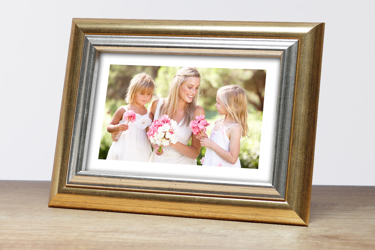 Klasyczna fotoramka w złotym kolorze ze srebrną wstawką o przekroju profilu 29x14 mm wykonana w 100% z drewna. Przeznaczona jest do oprawy fotografii, plakatów i dyplomów. W zależności od formatu wyposażona jest w szkło mineralne lub bezbarwne szkło organiczne - wysokiej jakości plexi. Plecki wykonane są z twardej płyty HDF. Ramki na zdjęcia do rozmiaru 18x24 cm dodatkowo posiadają stopkę / nóżkę która pozwala eksponować oprawiony obraz na biurku lub regale. Ramka drewniana DRL S 80 dostępna jest w rozmiarach od 10x15 cm do 50x70 cm.