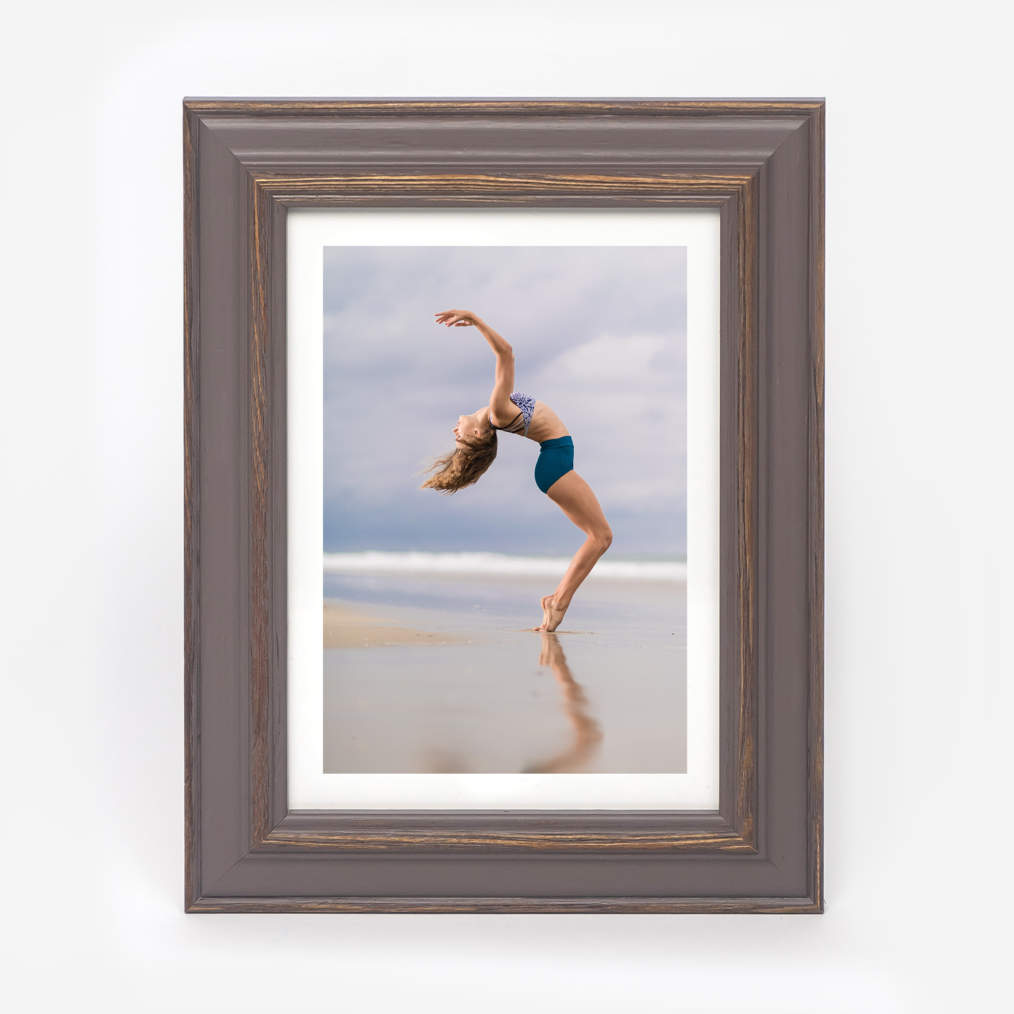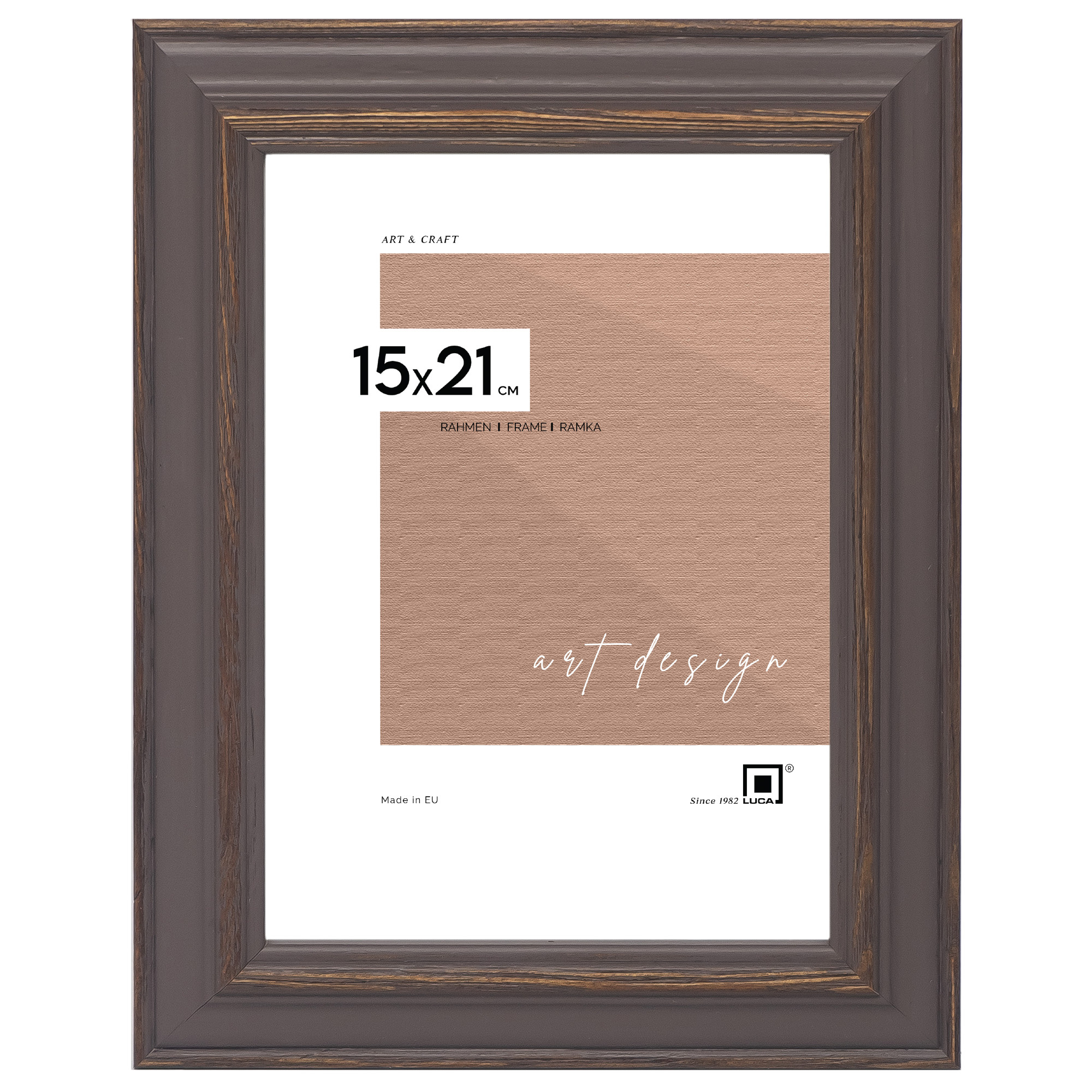 Nowoczesna fotoramka w brązowym kolorze z przetarciami o przekroju profilu 30x15 mm wykonana w 100% z drewna. Przeznaczona jest do oprawy fotografii, plakatów i dyplomów. W zależności od formatu wyposażona jest w szkło mineralne lub bezbarwne szkło organiczne - wysokiej jakości plexi. Plecki wykonane są z twardej płyty HDF. Ramki na zdjęcia do rozmiaru 18x24 cm dodatkowo posiadają stopkę / nóżkę która pozwala eksponować oprawiony obraz na biurku lub regale. Ramka drewniana DRL X 02 dostępna jest w rozmiarach od 10x15 cm do 50x70 cm.