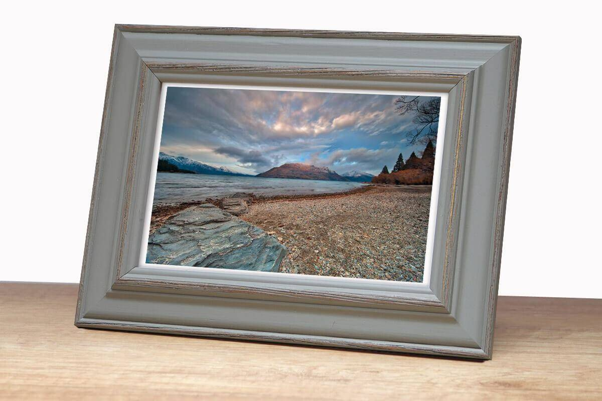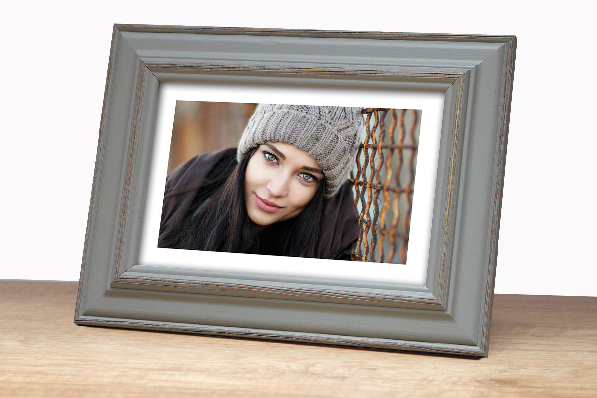 Nowoczesna fotoramka w szaro-brązowym kolorze z przetarciami o przekroju profilu 30x15 mm wykonana w 100% z drewna. Przeznaczona jest do oprawy fotografii, plakatów i dyplomów. W zależności od formatu wyposażona jest w szkło mineralne lub bezbarwne szkło organiczne - wysokiej jakości plexi. Plecki wykonane są z twardej płyty HDF. Ramki na zdjęcia do rozmiaru 18x24 cm dodatkowo posiadają stopkę / nóżkę która pozwala eksponować oprawiony obraz na biurku lub regale. Ramka drewniana DRL X 05 dostępna jest w rozmiarach od 10x15 cm do 50x70 cm.