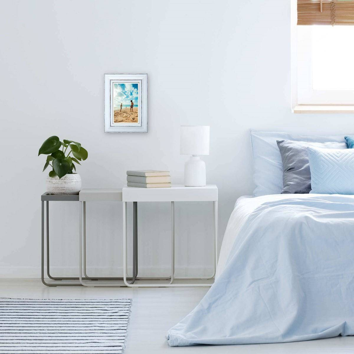 Rustykalna fotoramka w biało-brązowym kolorze z przetarciami o przekroju profilu 30x15 mm wykonana w 100% z drewna. Przeznaczona jest do oprawy fotografii, plakatów i dyplomów. W zależności od formatu wyposażona jest w szkło mineralne lub bezbarwne szkło organiczne - wysokiej jakości plexi. Plecki wykonane są z twardej płyty HDF. Ramki na zdjęcia do rozmiaru 18x24 cm dodatkowo posiadają stopkę / nóżkę która pozwala eksponować oprawiony obraz na biurku lub regale. Ramka drewniana DRL X 4 dostępna jest w rozmiarach od 10x15 cm do 50x70 cm.
