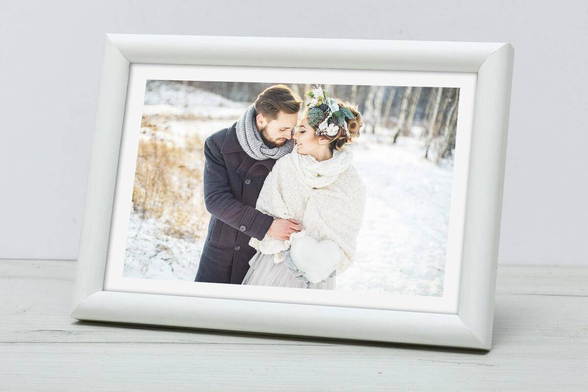 Nowoczesna fotoramka w białym kolorze o przekroju profilu 12x13 mm wykonana w 100% z drewna. Przeznaczona jest do oprawy fotografii, plakatów i dyplomów. W zależności od formatu wyposażona jest w szkło mineralne lub bezbarwne szkło organiczne - wysokiej jakości plexi. Plecki wykonane są z twardej płyty HDF. Ramki na zdjęcia do rozmiaru 18x24 cm dodatkowo posiadają stopkę / nóżkę która pozwala eksponować oprawiony obraz na biurku lub regale. Ramka drewniana DRWC F 1 dostępna jest w rozmiarach od 10x15 cm do 40x50 cm.