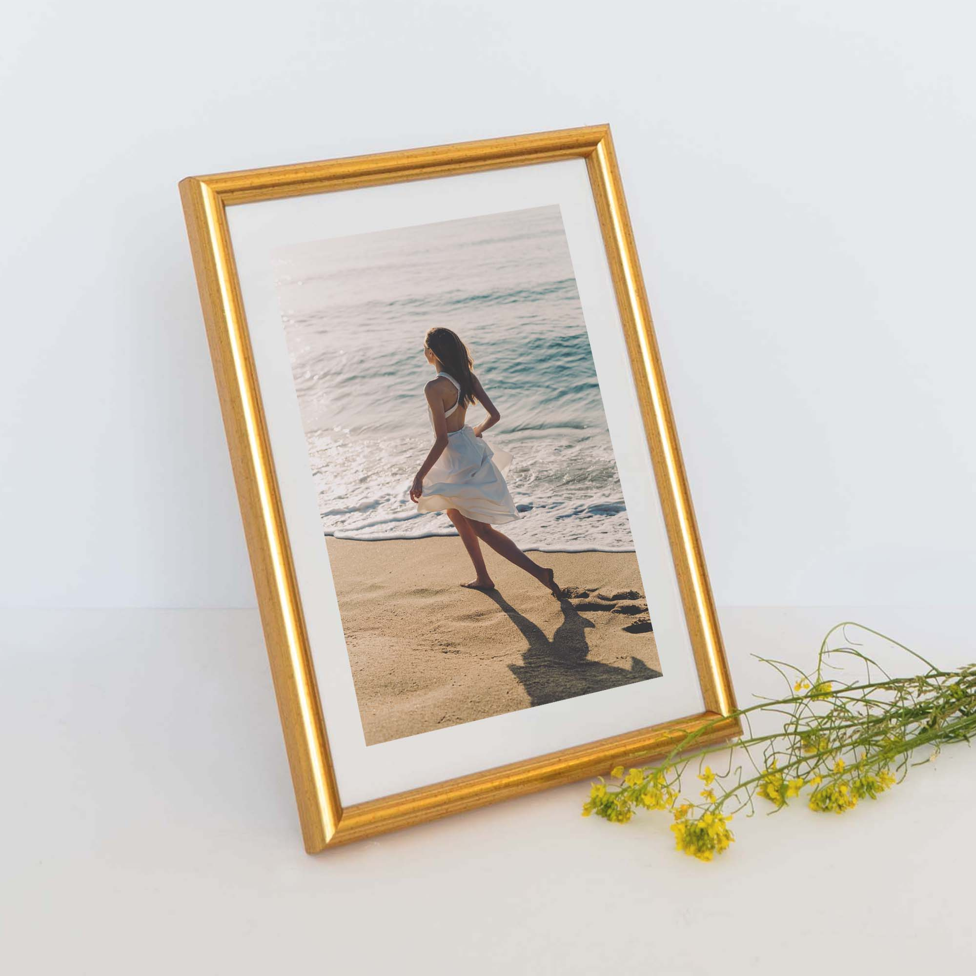 Ramka DRWC F Z w kolorze złotym to piękna propozycja dla osób szukających eleganckiego i nowoczesnego wzornictwa. Widoczny, ale delikatny profil ramy i żywa barwa złota akcentuje, ale nie dominuje oprawionego wspomnienia, dyplomu lub grafiki. Te zalety w połączeniu z trwałością ramki wykonanej z wyselekcjonowanego drewna pozwoli dodać ciepła każdemu pomieszczenie dodająć interesującego akcentu.
