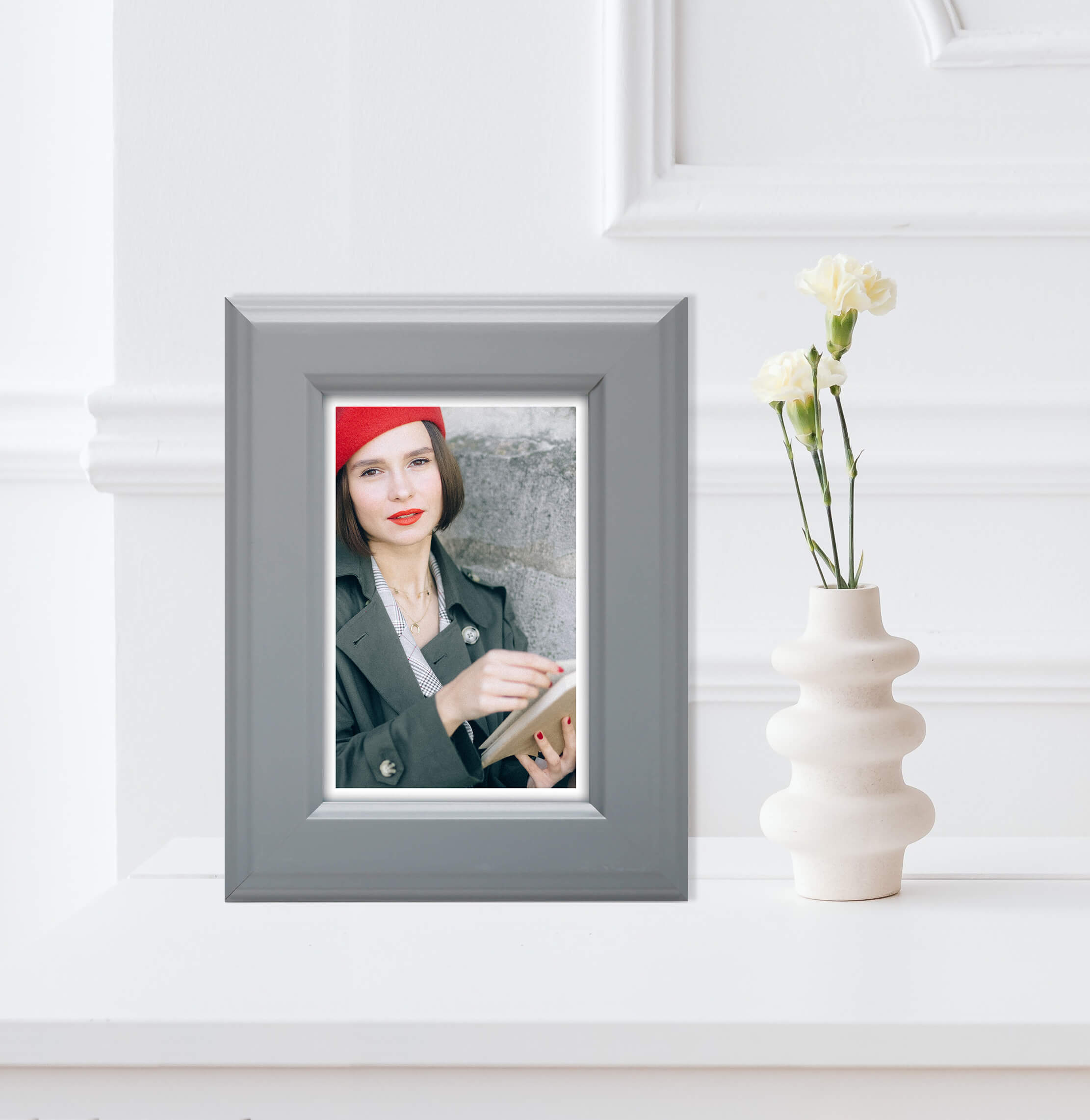 Nowoczesna fotoramka w jasno-szarym kolorze o przekroju profilu 34x16 mm wykonana w 100% z drewna. Przeznaczona jest do oprawy fotografii, plakatów i dyplomów. W zależności od formatu wyposażona jest w szkło mineralne lub bezbarwne szkło organiczne - wysokiej jakości plexi. Plecki wykonane są z twardej płyty HDF. Ramki na zdjęcia do rozmiaru 18x24 cm dodatkowo posiadają stopkę / nóżkę która pozwala eksponować oprawiony obraz na biurku lub regale. Ramka drewniana DRZ A 05 dostępna jest w rozmiarach od 10x15 cm do 50x70 cm.