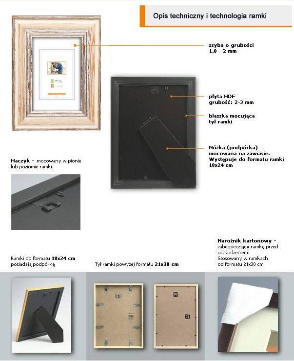 Ramka: z drewna sosnowego. Przód oprawy: szkło mineralne, o grubości 2 mm występuje do formatu 30x40 (włącznie)  / powyżej szkło organiczne 2 mm - plexi. Tył oprawy: wykonany jest z twardej płyty HDF o grubości 3 mm. Blaszki mocujące: miękkie blaszki mocujące tył ramki, zapewniają możliwość wielokrotnego otwierania. Ramka z podpórką: stopka występuje do formatu 18x24 cm umożliwia postawienie w pionie lub poziomie. Wieszak: stabilna metalowa zawieszka z możliwością ekspozycji pionowo lub poziomo. Opakowanie: ramki posiadają zabezpieczające narożniki tekturowe oraz folię ochronną. Gwarancja satysfakcji: Najwyższa jakość, gatunek I. Produkt polski.