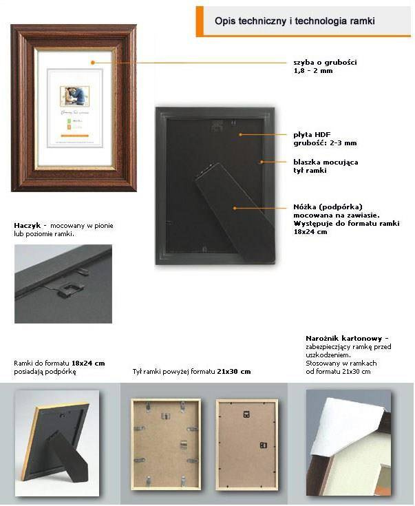 Ramka: z drewna sosnowego. Przód oprawy: szkło mineralne, o grubości 2 mm występuje do formatu 30x40 (włącznie)  / powyżej szkło organiczne 2 mm - plexi. Tył oprawy: wykonany jest z twardej płyty HDF o grubości 3 mm. Blaszki mocujące: miękkie blaszki mocujące tył ramki, zapewniają możliwość wielokrotnego otwierania. Ramka z podpórką: stopka występuje do formatu 18x24 cm umożliwia postawienie w pionie lub poziomie. Wieszak: stabilna metalowa zawieszka z możliwością ekspozycji pionowo lub poziomo. Opakowanie: ramki posiadają zabezpieczające narożniki tekturowe oraz folię ochronną. Gwarancja satysfakcji: Najwyższa jakość, gatunek I. Produkt polski.