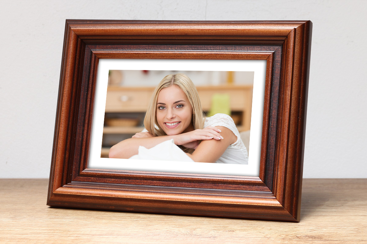 Klasyczna fotoramka w brązowym kolorze o przekroju profilu 32x21 mm wykonana w 100% z drewna. Przeznaczona jest do oprawy fotografii, plakatów i dyplomów. W zależności od formatu wyposażona jest w szkło mineralne lub bezbarwne szkło organiczne - wysokiej jakości plexi. Plecki wykonane są z twardej płyty HDF. Ramki na zdjęcia do rozmiaru 18x24 cm dodatkowo posiadają stopkę / nóżkę która pozwala eksponować oprawiony obraz na biurku lub regale. Ramka drewniana DRZ S 44 dostępna jest w rozmiarach od 10x15 cm do 50x70 cm.