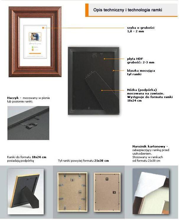 Ramka: z drewna sosnowego. Przód oprawy: szkło mineralne, o grubości 2 mm występuje do formatu 30x40 (włącznie) / powyżej szkło organiczne 2 mm - plexi. Tył oprawy: wykonany jest z twardej płyty HDF o grubości 3 mm. Blaszki mocujące: miękkie blaszki mocujące tył ramki, zapewniają możliwość wielokrotnego otwierania. Ramka z podpórką: stopka występuje do formatu 18x24 cm umożliwia postawienie w pionie lub poziomie. Wieszak: stabilna metalowa zawieszka z możliwością ekspozycji pionowo lub poziomo. Opakowanie: ramki posiadają zabezpieczające narożniki tekturowe oraz folię ochronną. Gwarancja satysfakcji: Najwyższa jakość, gatunek I. Produkt polski
