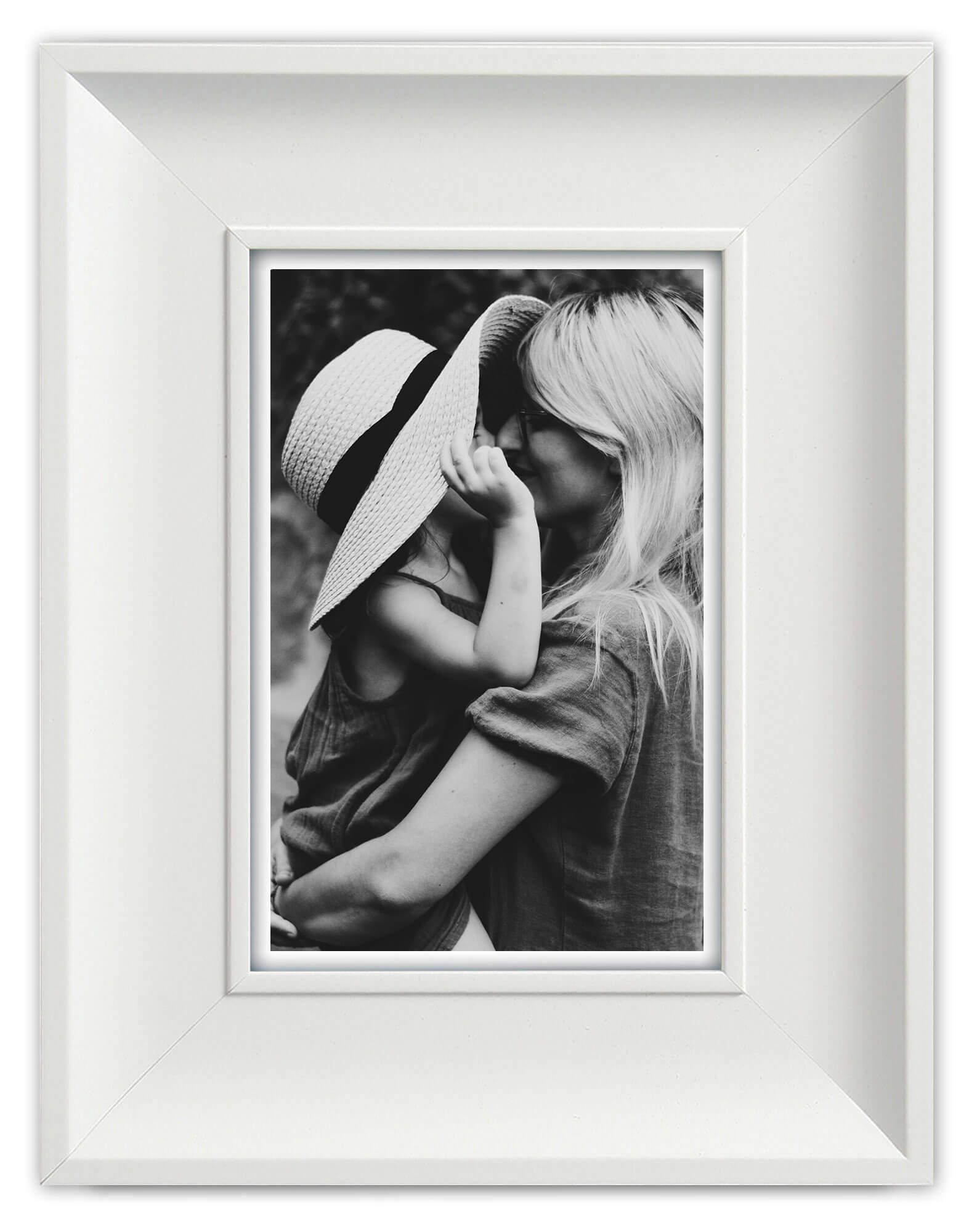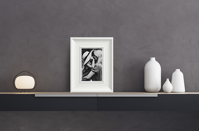 Klasyczna fotoramka w białym matowym kolorze o przekroju profilu 41x22 mm wykonana w 100% z drewna. Przeznaczona jest do oprawy fotografii, plakatów i dyplomów. W zależności od formatu wyposażona jest w szkło mineralne lub bezbarwne szkło organiczne - wysokiej jakości plexi. Plecki wykonane są z twardej płyty HDF. Ramki na zdjęcia do rozmiaru 18x24 cm dodatkowo posiadają stopkę / nóżkę która pozwala eksponować oprawiony obraz na biurku lub regale. Ramka drewniana DRZG D 1 dostępna jest w rozmiarach od 10x15 cm do 50x70 cm.