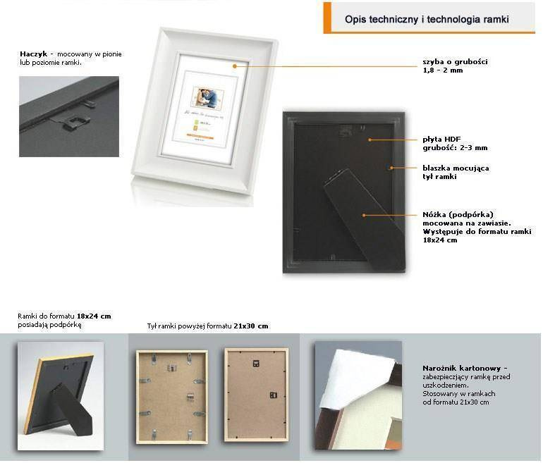 Ramka: z drewna sosnowego. Przód oprawy: szkło mineralne, o grubości 2 mm występuje do formatu 30x40 (włącznie)  / powyżej szkło organiczne 2 mm - plexi. Tył oprawy: wykonany jest z twardej płyty HDF o grubości 3 mm. Blaszki mocujące: miękkie blaszki mocujące tył ramki, zapewniają możliwość wielokrotnego otwierania. Ramka z podpórką: stopka występuje do formatu 18x24 cm umożliwia postawienie w pionie lub poziomie. Wieszak: stabilna metalowa zawieszka z możliwością ekspozycji pionowo lub poziomo. Opakowanie: ramki posiadają zabezpieczające narożniki tekturowe oraz folię ochronną. Gwarancja satysfakcji: Najwyższa jakość, gatunek I. Produkt polski.