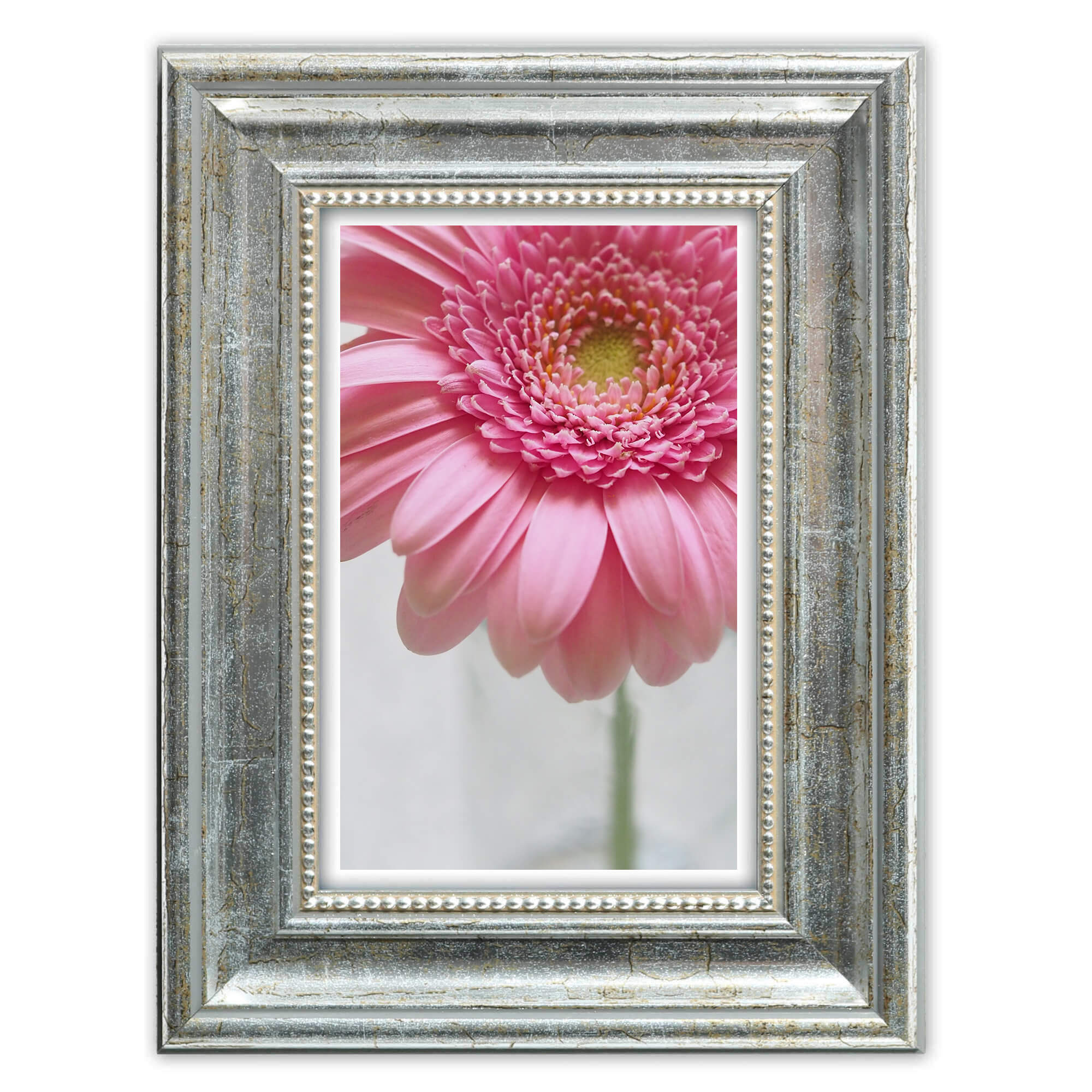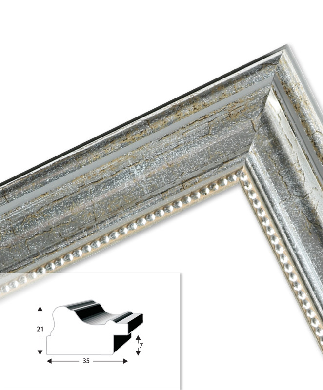 Klasyczna fotoramka w srebrnym spękanym kolorze o przekroju profilu 35x21 mm wykonana w 100% z drewna. Przeznaczona jest do oprawy fotografii, plakatów i dyplomów. W zależności od formatu wyposażona jest w szkło mineralne lub bezbarwne szkło organiczne - wysokiej jakości plexi. Plecki wykonane są z twardej płyty HDF. Ramki na zdjęcia do rozmiaru 18x24 cm dodatkowo posiadają stopkę / nóżkę która pozwala eksponować oprawiony obraz na biurku lub regale. Ramka drewniana DRZG M S dostępna jest w rozmiarach od 10x15 cm do 50x70 cm.